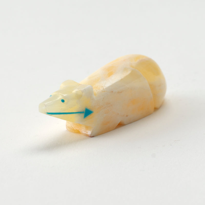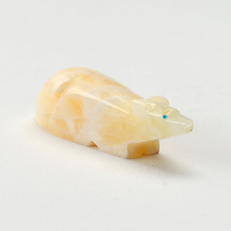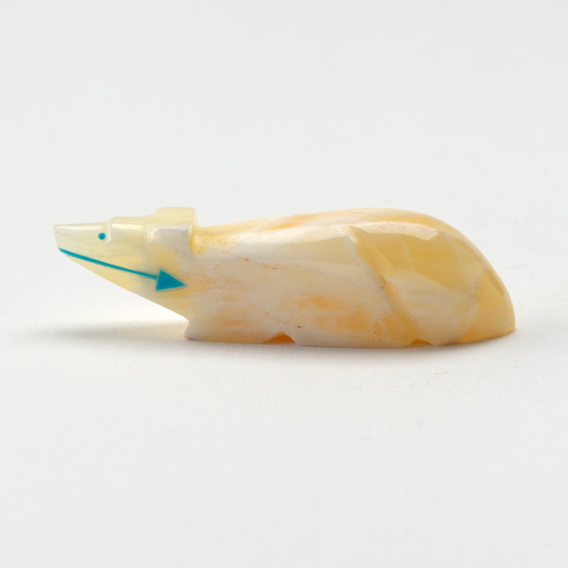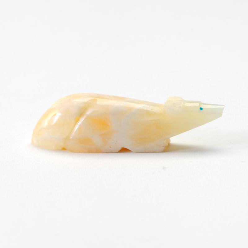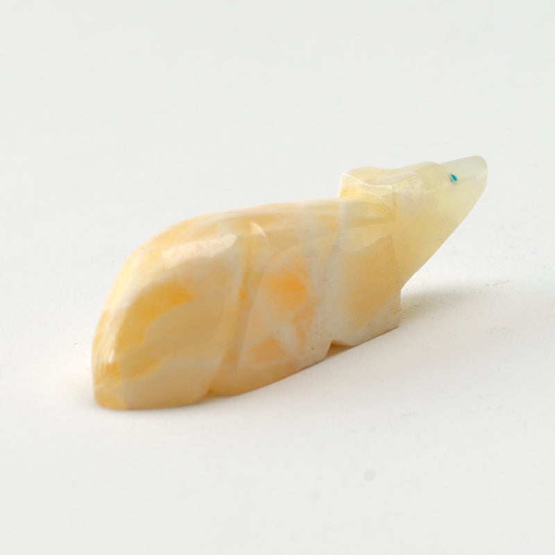The mixture of the warm, golden tones of the calcite with the vibrant pop of turquoise creates a beautiful contrast that draws you in. Not to mention, the craftsmanship on this piece is impeccable, from the intricate detailing on the wolf's smooth polish of the stone to the beautiful inlayed turquoise heartline.