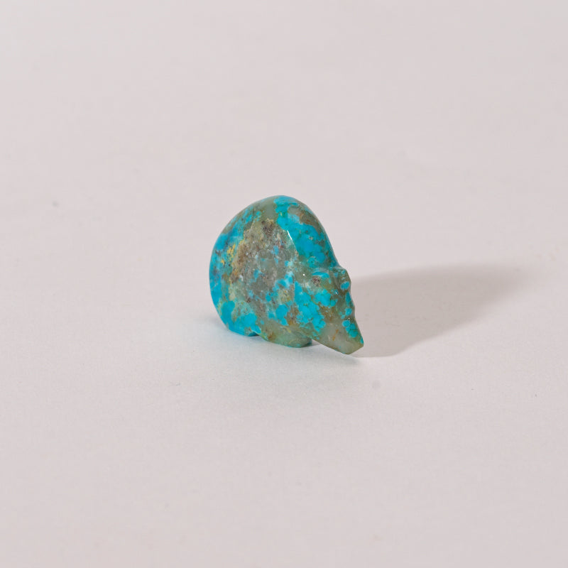 This bear is beautifully carved from turquoise, showcasing rich blue tones that reflect strength, protection, and healing. The form is solid and well balanced, capturing the bear’s powerful yet calm presence. Inlaid turquoise eyes bring life and harmony to the expression, while a carefully inlaid heartline symbolizes the bear’s inner spirit and connection between heart, breath, and life force. Polished to highlight the natural beauty of the stone, this carving is a meaningful and timeless example of Zuni artistry.