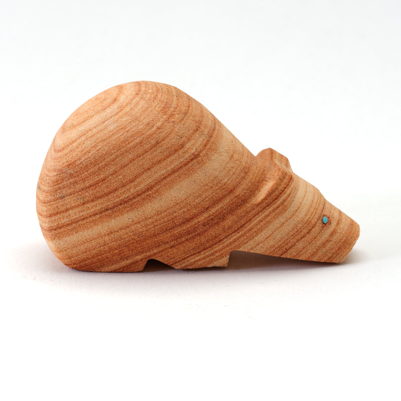 The Utah sandstone carved bear with turquoise eyes is a delightful piece that exudes a sense of tranquility and whimsy. The warm, earthy tones of the sandstone gives it a lifelike quality that is truly captivating. The addition of the turquoise eyes adds a pop of color and sparkle, drawing the viewer in to admire the craftsmanship and attention to detail.
