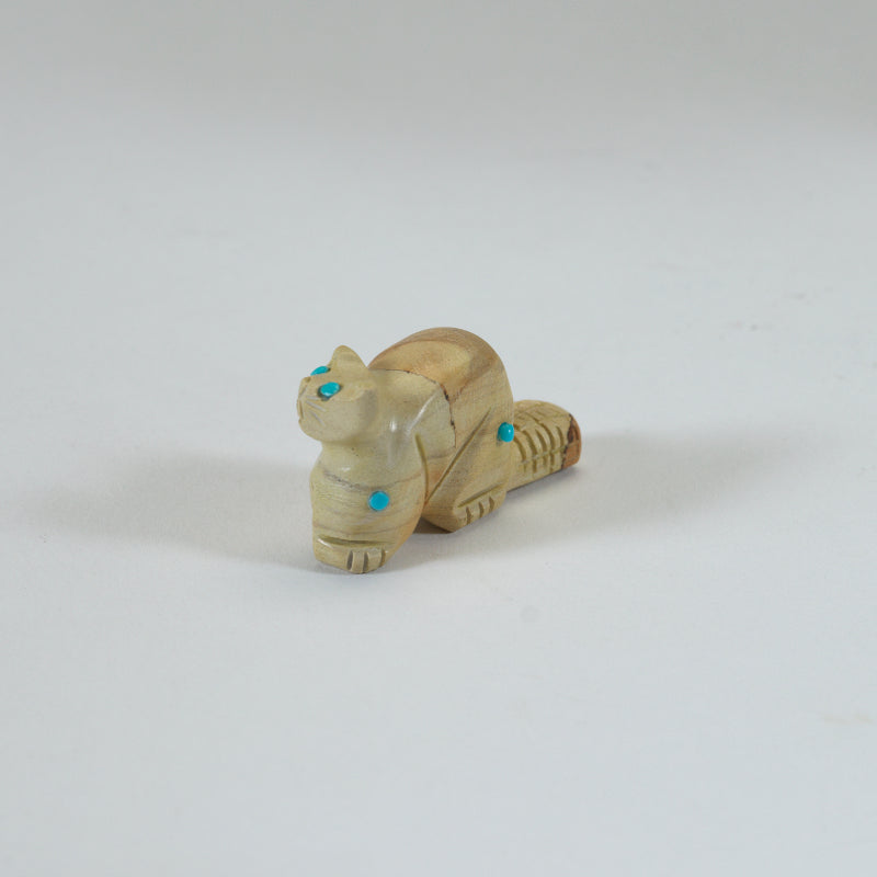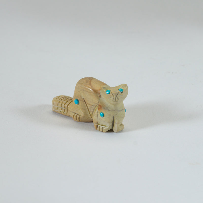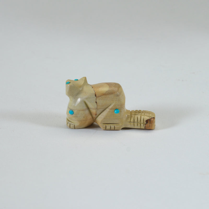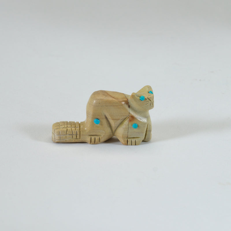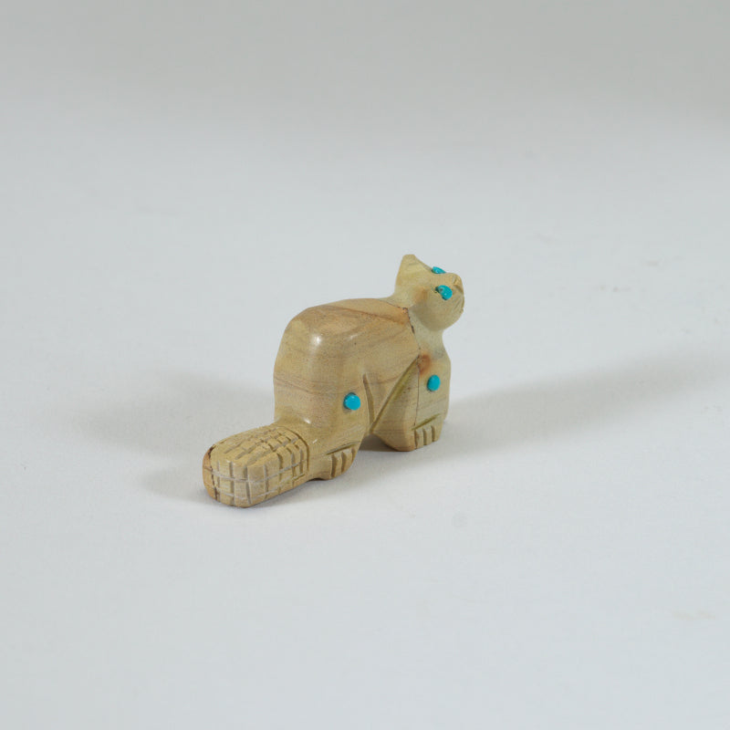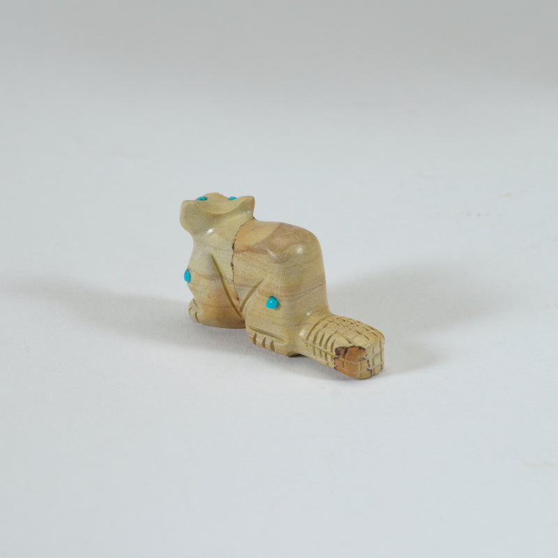 This cute little jasper carved beaver with turquoise dots is an adorable addition to any collection or gift for a nature lover. The turquoise dots add a pop of color to this charming piece, making it stand out amongst other decorative items. This beaver figurine is not only aesthetically pleasing but also holds cultural significance as the beaver is known for its industrious nature and strong work ethic in Native American symbolism.