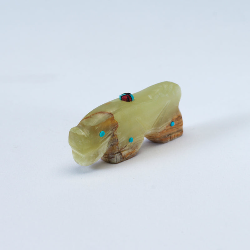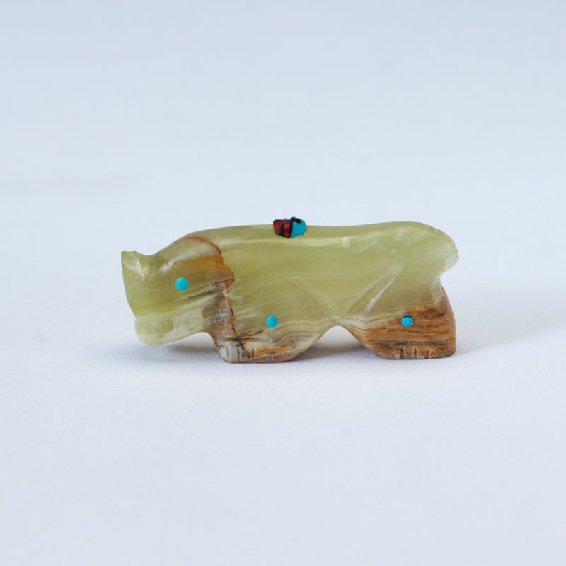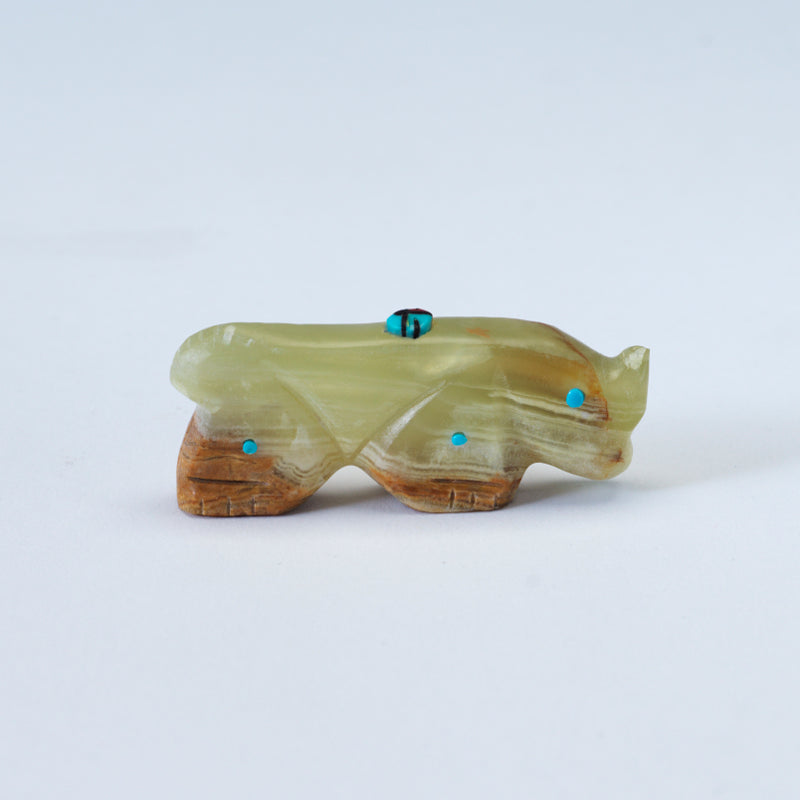 The combination of the rich green and brown tones of the onyx create an aura of strength and earthiness, while the vibrant turquoise eyes add a touch of brilliance and depth to the piece. The intricately detailed sunface on its back brings a sense of ancient symbolism and mystery, as if this rhinoceros is not simply an animal but a sacred creature with a connection to the spiritual realm.