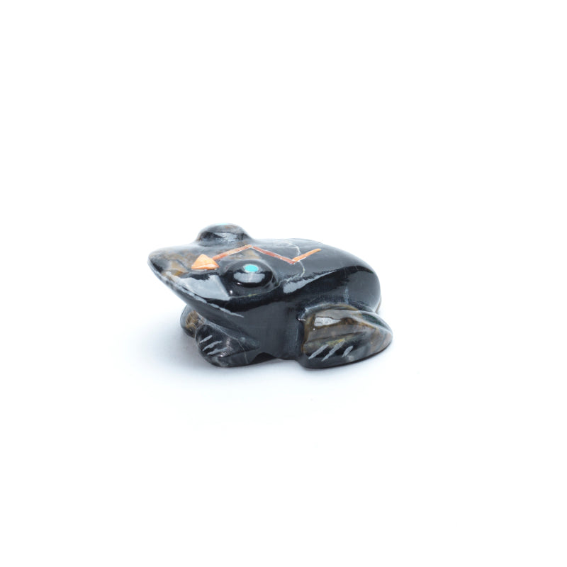 The marble’s surface is polished smooth, its deep tones swirling like storm clouds across the frog’s compact, poised body. The contrast between dark gray and inky black gives the carving a sense of quiet strength and natural camouflage, as if the frog could vanish into stone or water at will. Its eyes are inlaid with turquoise, bright and luminous—two vivid gems that bring life and presence to the piece. The turquoise stands out brilliantly against the dark marble, adding a spark of sacred energy and reinforcing the frog’s symbolic connection to water, healing, and transformation. Running down its back is an inlaid spiny oyster heartline—a bold, radiant line of deep orange to reddish-pink shell, representing the life force and breath of spirit. The heartline, a traditional symbol in Zuni and other Native American carvings, starts at the mouth (where life enters) and leads to the heart, signifying inner strength, purpose, and the path of vitality. Together, the elements make this frog a powerful fetish of renewal, protection, and spiritual direction. The combination of dark Picasso marble, vibrant turquoise eyes, and the radiant spiny oyster heartline gives the piece a compelling visual and symbolic contrast—earth and water, stillness and energy, stone and spirit, all held in one sacred form.