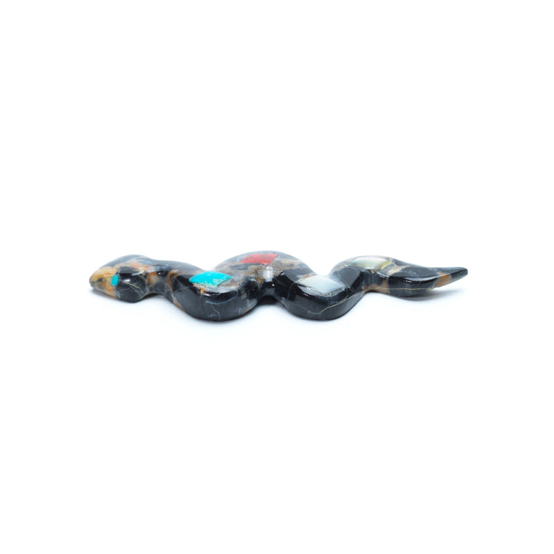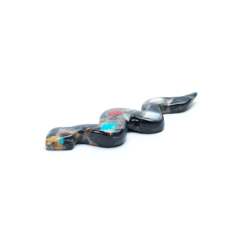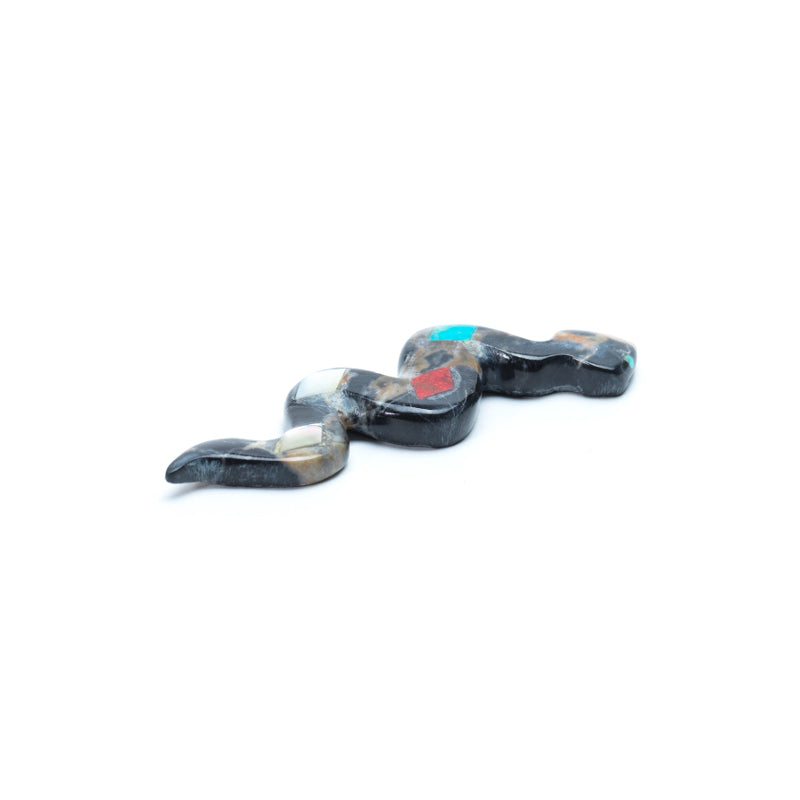 Running along the snake’s back is a striking inlay of diamond-shaped motifs—a repeating pattern of turquoise, coral, and mother of pearl.