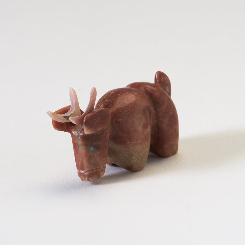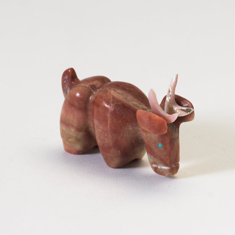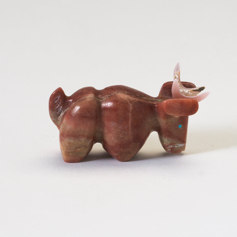As light dances upon the smooth surface of the alabaster, it casts a warm glow that enhances the natural beauty of the piece, giving it an ethereal quality that sets it apart from any other art form. The addition of abalone horns and turquoise eyes adds a touch of opulence and mysticism, elevating this carving to a level of divine elegance that demands admiration and reverence.