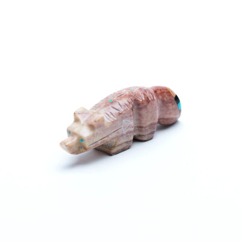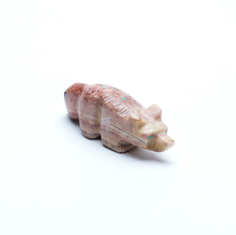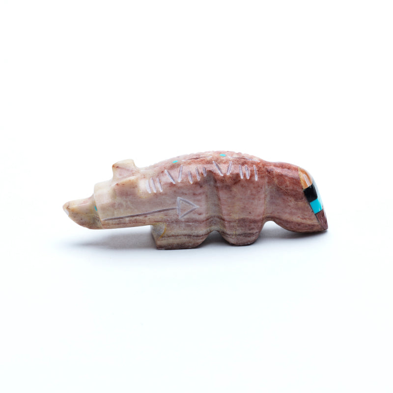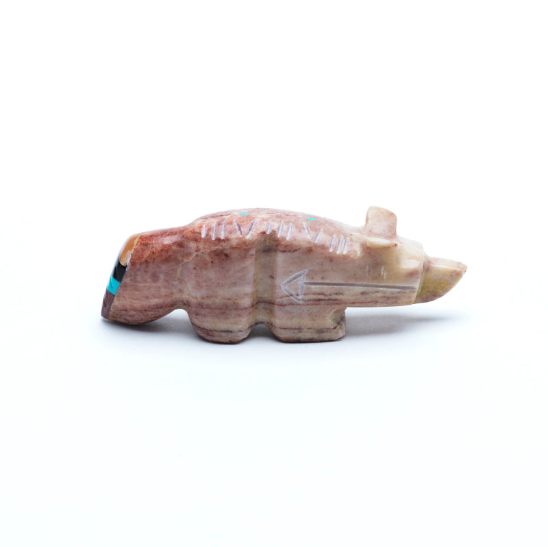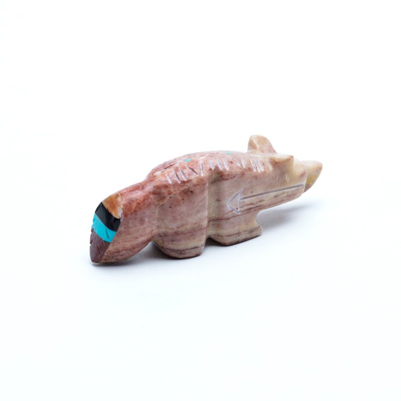 Pipestone, deep red and smooth, ties the figure to the earth, tradition, and ancestral spirit.