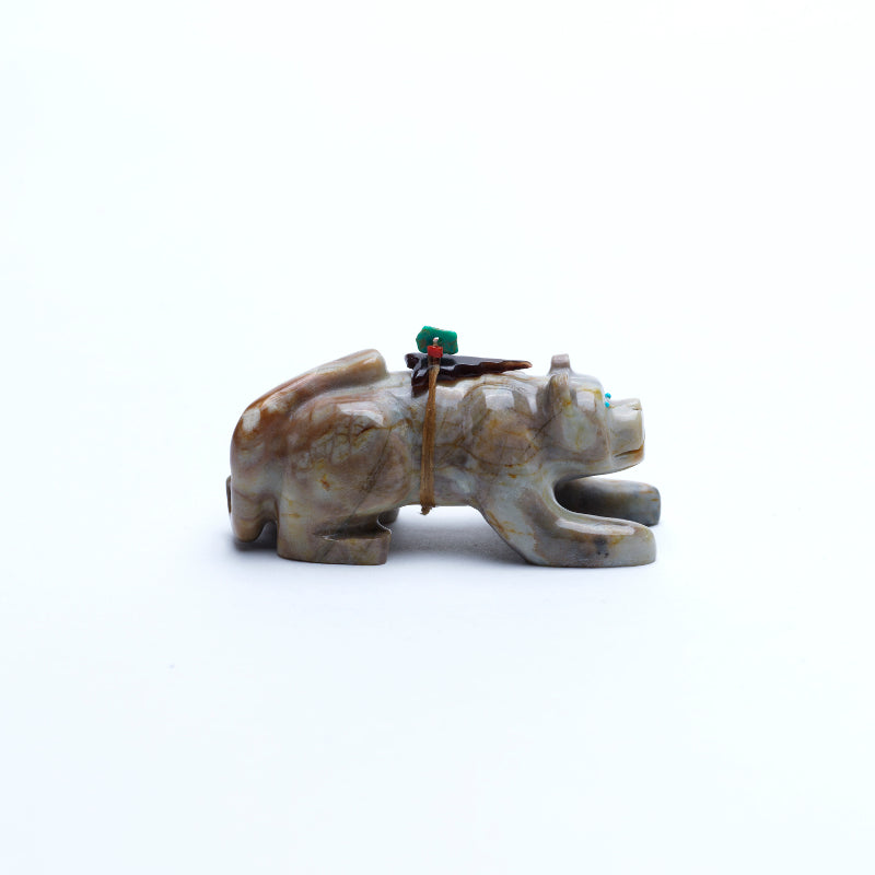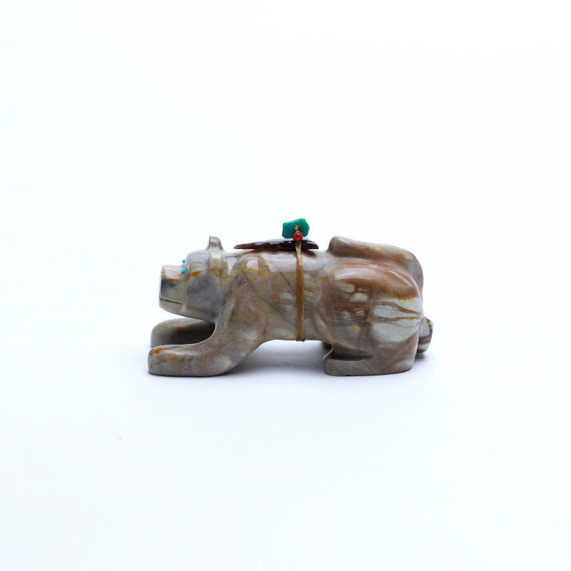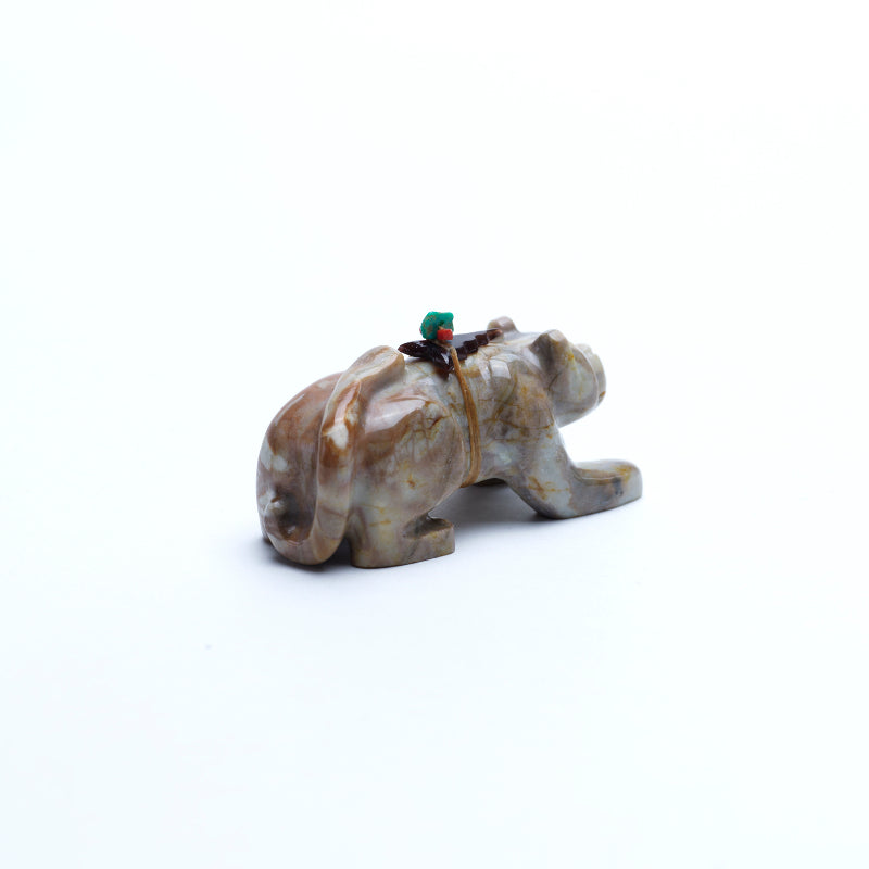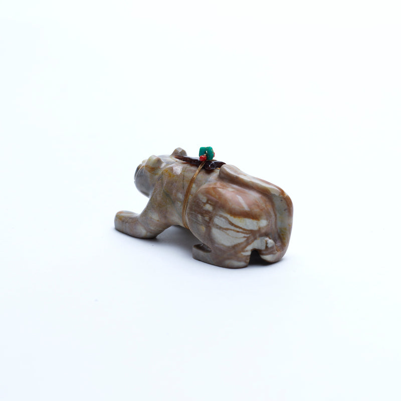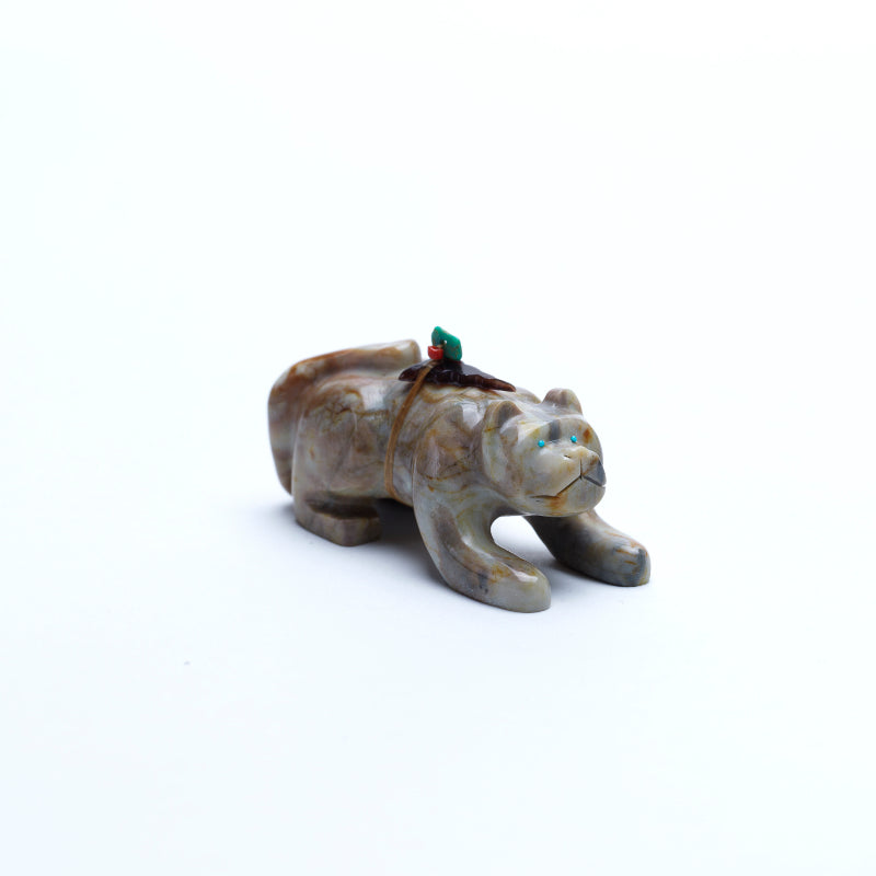 The mountain lion is carved in a poised, grounded stance, its body elongated and muscles defined, as if caught mid-prowl. The tail curves with balance, and its head is slightly lowered—focused, alert, and ready. The stylization emphasizes the feline's agility and quiet intensity rather than detailed realism, allowing the stone’s natural patterning to suggest the texture of fur and shadow. Its eyes are inlaid with turquoise, vibrant and watchful. The cool blue stones stand out against the earthy tones of the marble, imbuing the figure with a striking spiritual presence. The turquoise eyes add a sense of awareness, giving the lion a soul—mysterious, protective, and deeply connected to its surroundings. On its back rests a small arrowhead made of penn shell, dark, iridescent, and symbolic. The shell’s subtle shimmer contrasts with the stone’s matte surface, and the arrowhead itself represents life, protection, direction, and power. In Zuni tradition, the presence of the arrowhead marks the animal as a guardian figure, its back bearing sacred energy and responsibility.