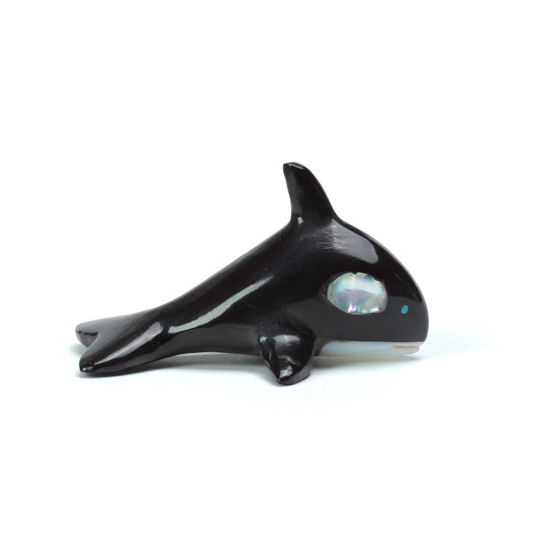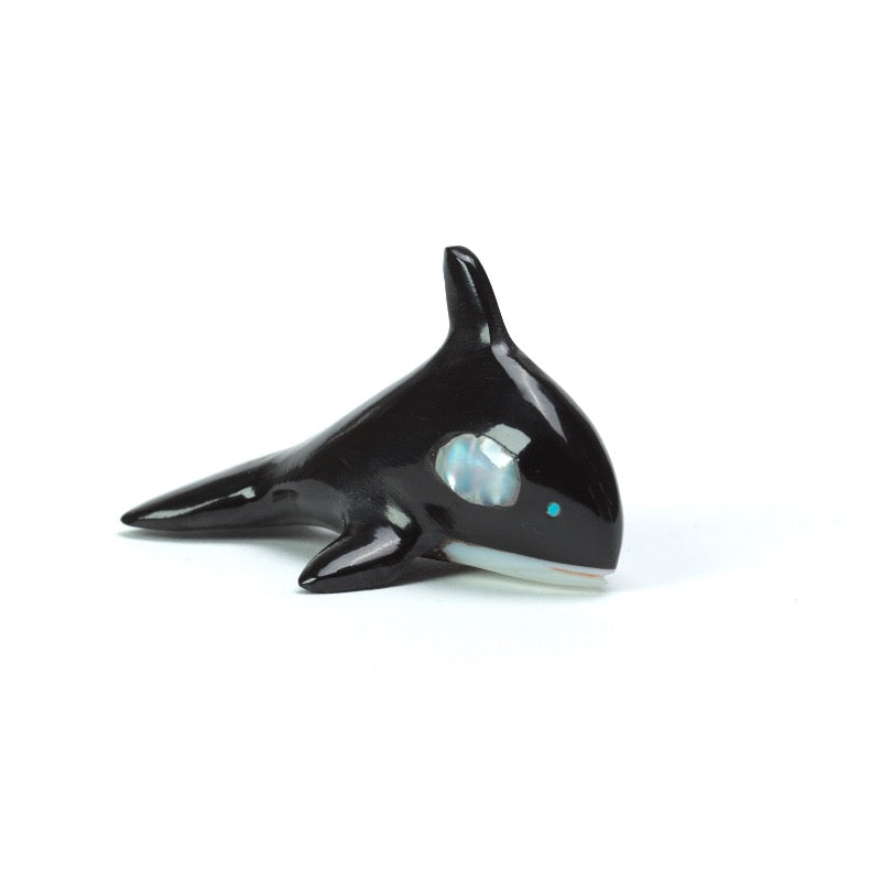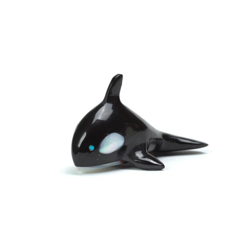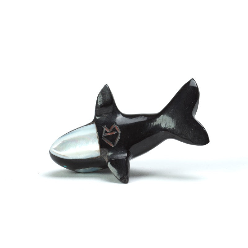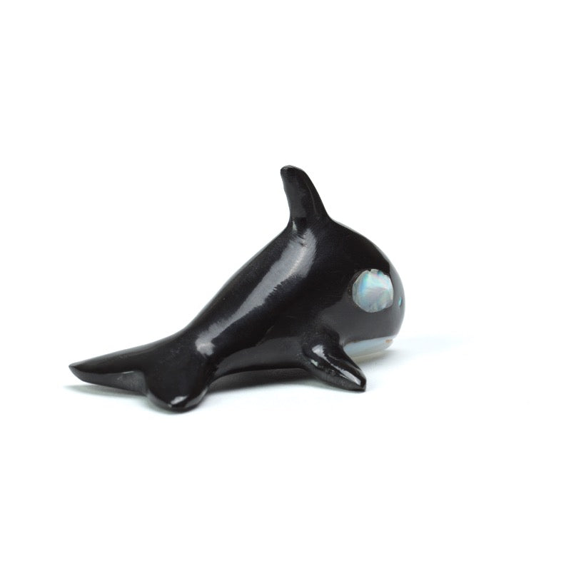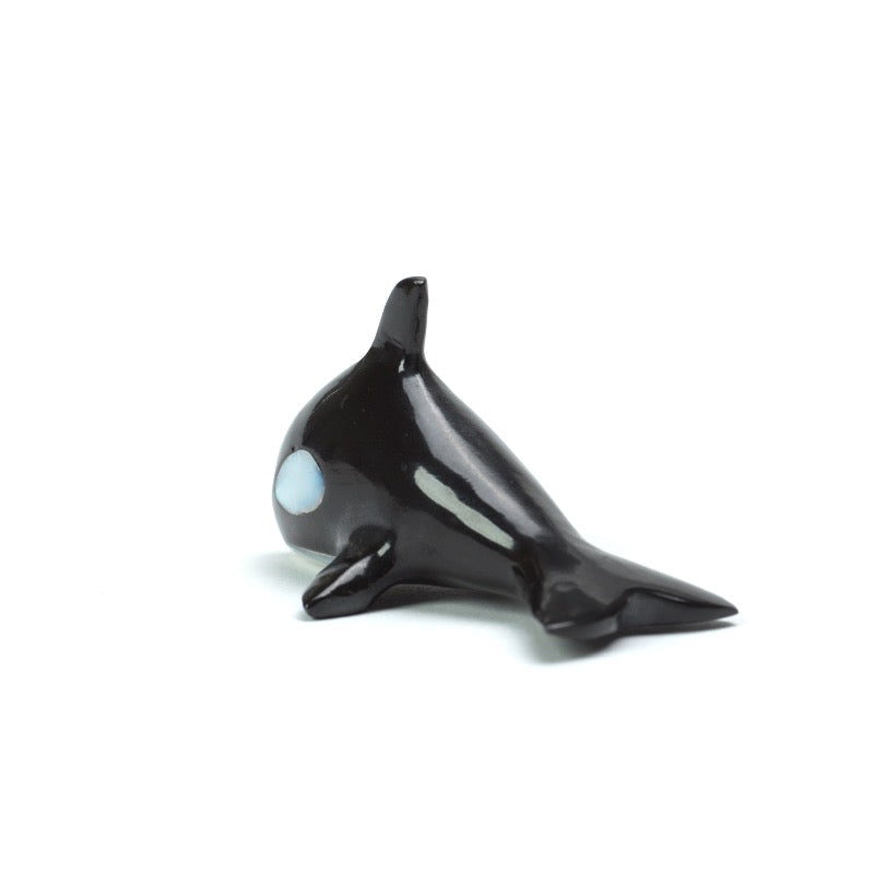 This awe-inspiring orca is expertly carved out of black marble and features intricate details that make it truly lifelike. But what makes it even more special is the mother of pearl shell inlay on its stomach, adding a touch of iridescent magic to the piece. The combination of the smooth marble and shimmering pearl creates a captivating contrast that immediately grabs attention.