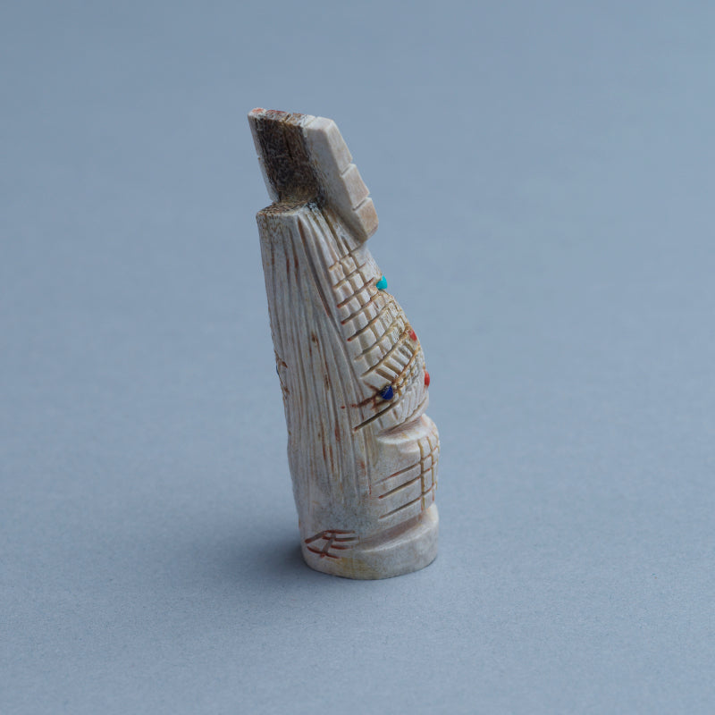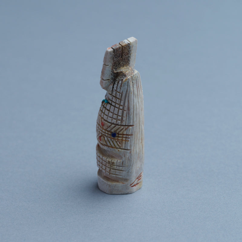 Usually the maiden fetish will be emerging from corn (the corn maiden) or she will have whorls of hair on the side of her head, signifying that she has not had a child. The mother fetish also can be emerging from the corn (the corn mother) and she will have children with her or look pregnant. The grandmother usually has a shawl over her head and no corn represented on her body.