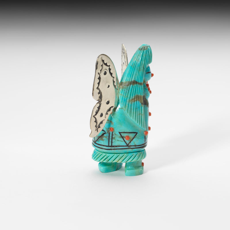 The brilliant blue hue of the turquoise brings out the vividness of the coral dots, adding a touch of color and vibrancy to the overall design. The sterling silver wings sparkle and shimmer in the light, giving this piece an ethereal quality that is simply mesmerizing. This butterfly maiden exudes grace, beauty, and elegance, making it a captivating addition to any collection.