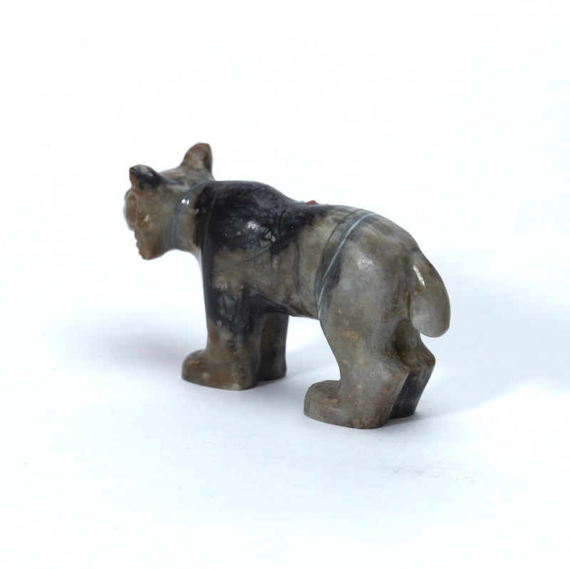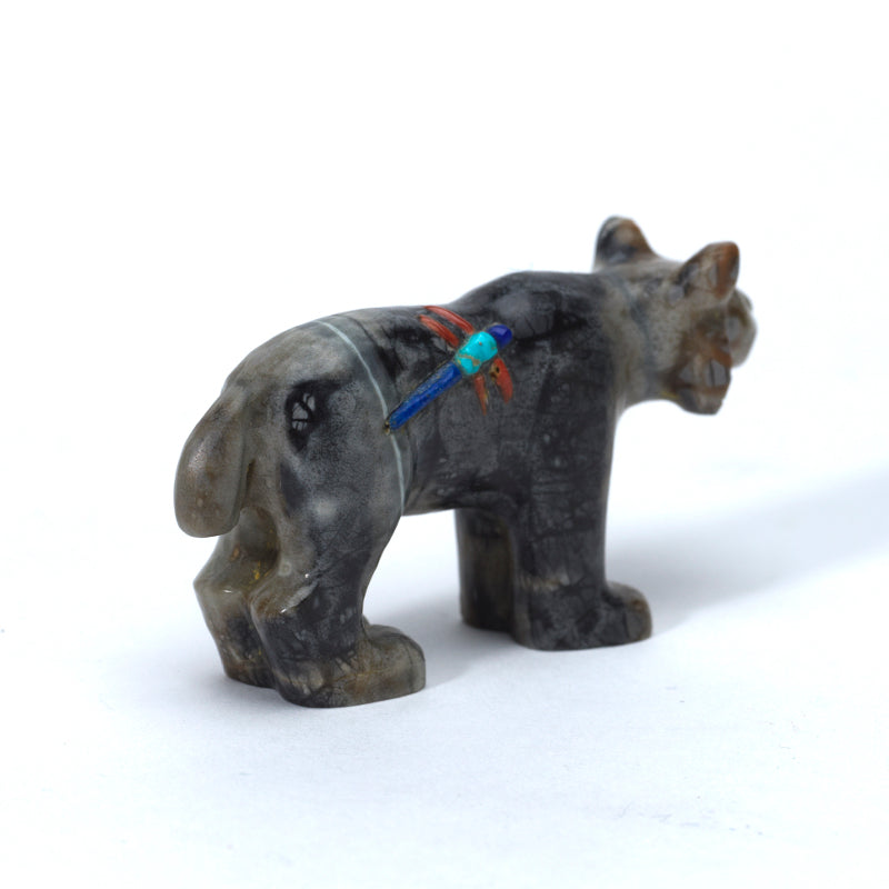 Carved from grey and brown Picasso Marble, this bobcat captures the wild elegance and alert stance of the feline, with the stone’s natural veining highlighting its muscular form. Its vivid turquoise eyes give the carving a striking lifelike presence. A delicate inlaid dragonfly, crafted from coral, lapis, and turquoise stones, adds a vibrant accent, blending artistry and symbolism to make this a truly unique and captivating work.