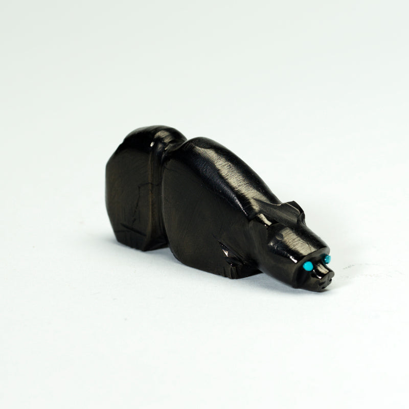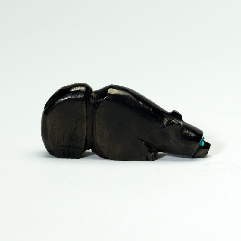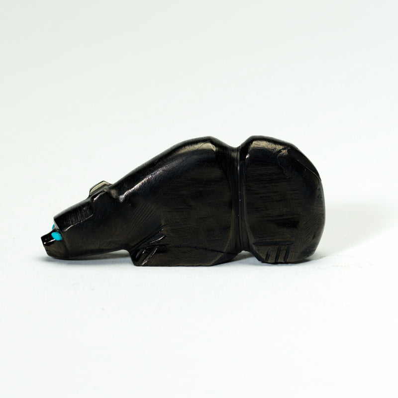 The use of black jet, a rare and highly sought-after material in Native American art, adds depth and contrast to the piece. The turquoise eyes bring life to the bear, adding a pop of color that draws the viewer's gaze. This unique creation is not only a beautiful work of art but also a celebration of cultural heritage and symbolism within the Zuni community.