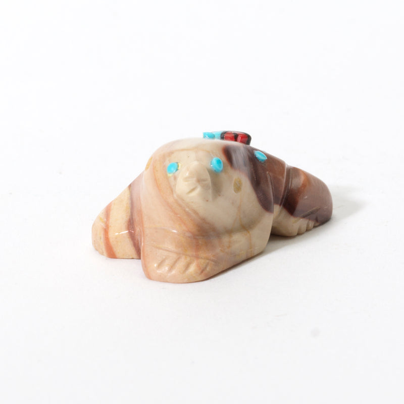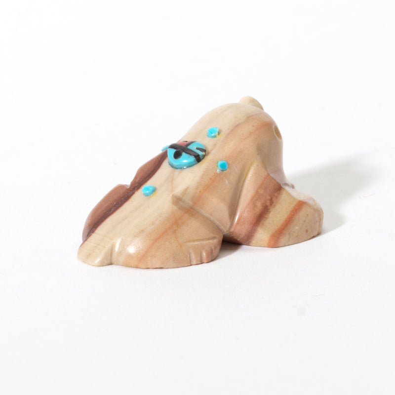 The smooth, creamy dolomite complements the vibrant turquoise stones, creating a visually striking contrast that draws the eye in. The attention to detail is impeccable, with each delicate claw and furrow meticulously rendered with precision. The use of turquoise for the eyes adds a touch of opulence and sophistication to this piece, elevating it from a mere figurine to a work of art.