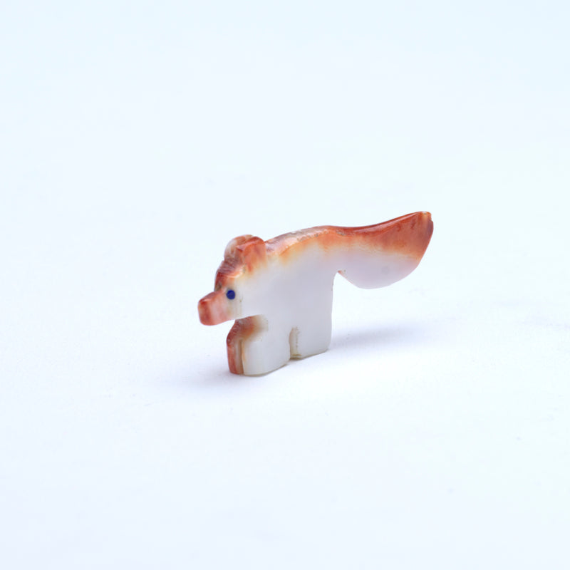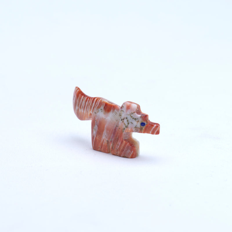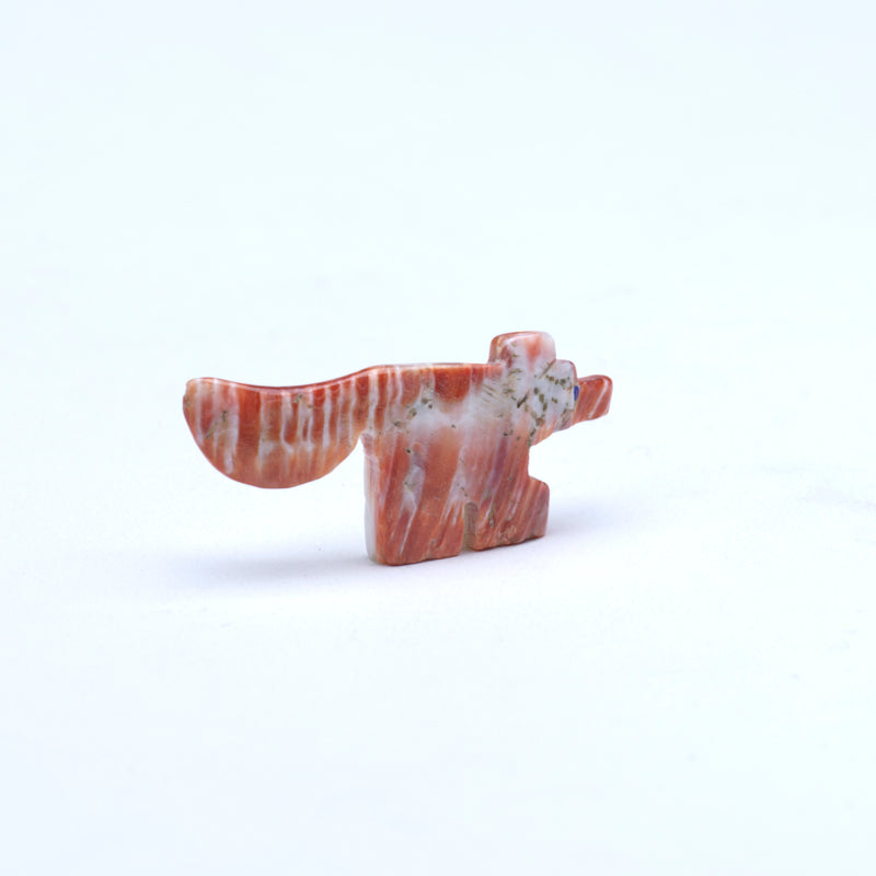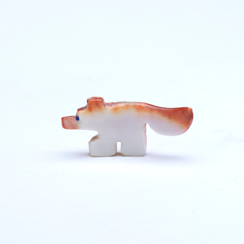 The use of spiny oyster shell in this carving adds a vibrant burst of color to the artwork, creating a stunning visual impact. The meticulous attention to detail is evident in every aspect of this piece, from the finely etched fur pattern to the realistic portrayal of the wolf's fierce expression.