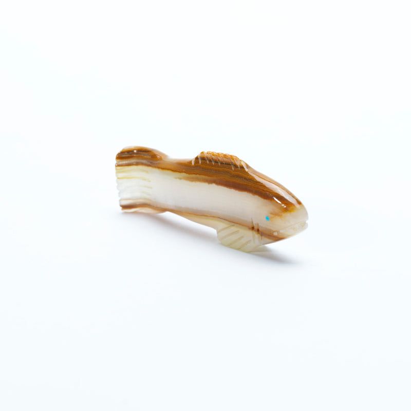 Baja onyx, a stunning stone known for its layered bands of cream, honey, amber, and soft caramel. The natural striations of the onyx flow across the fish’s body like ripples in water, giving the piece a sense of motion and depth even in stillness. The stone’s smooth, polished surface catches the light beautifully, enhancing its warm, translucent qualities. The carving is fluid and lifelike, with gently curved fins and a tapered tail that evoke graceful underwater movement. Each contour is thoughtfully shaped to reflect the organic elegance of a fish in motion, as if it were gliding through calm waters. Set into the fish’s head are two inlaid turquoise eyes, their vibrant blue a striking contrast to the earthy tones of the onyx. The turquoise lends the piece a spark of life and spirit, symbolizing clarity, protection, and connection to the natural world.