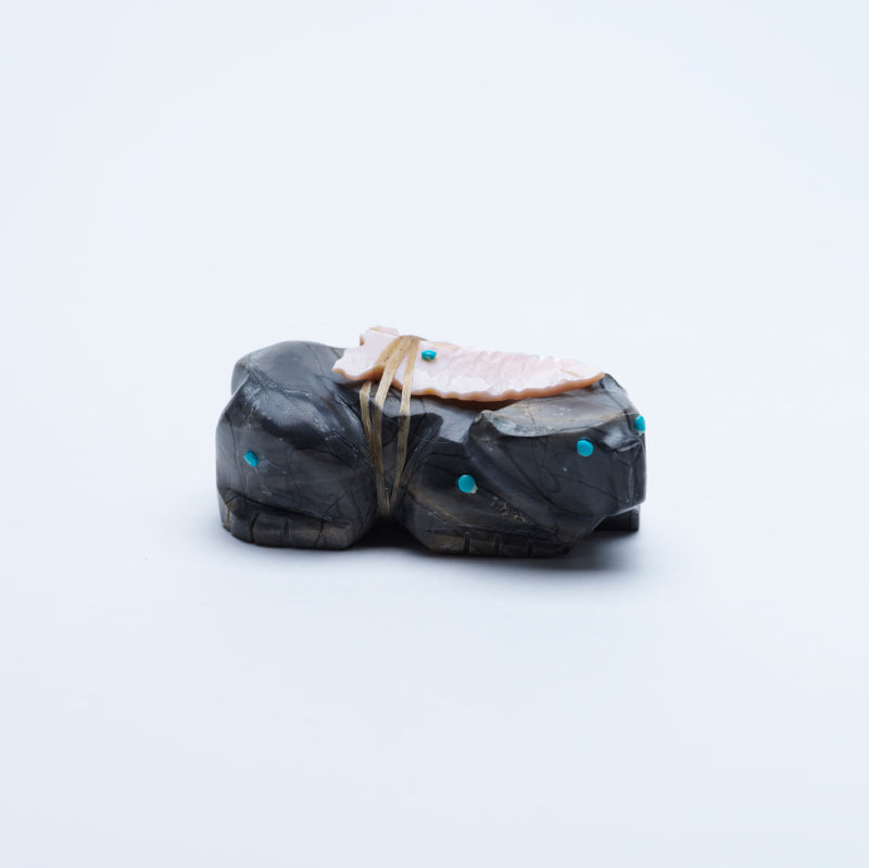The bold choice of stone gives the bear a sense of strength and resilience, as if it has weathered countless storms and challenges. The piercing turquoise eyes give the bear an intense and almost otherworldly presence, as if it is gazing into the depths of one's soul. The addition of the pink shell arrowhead on its back adds an element of mystery and intrigue, hinting at the bear's prowess as a skilled hunter or warrior.