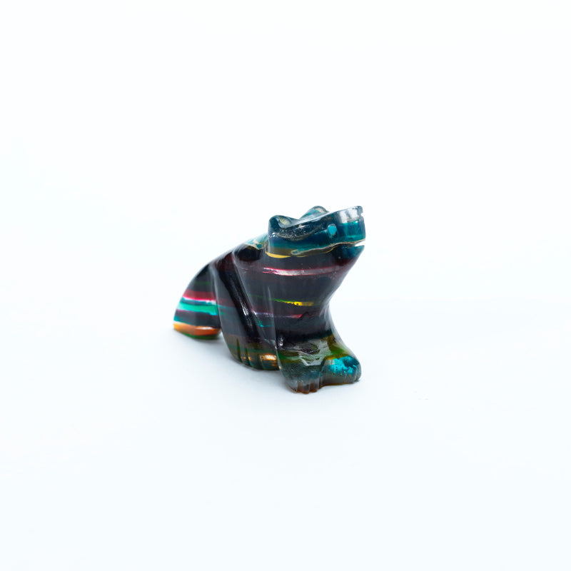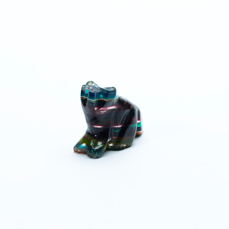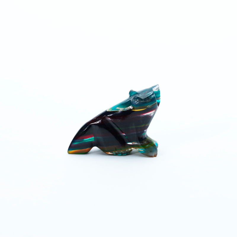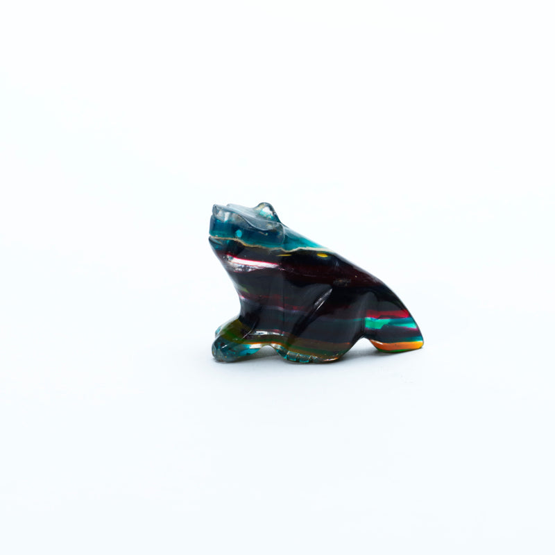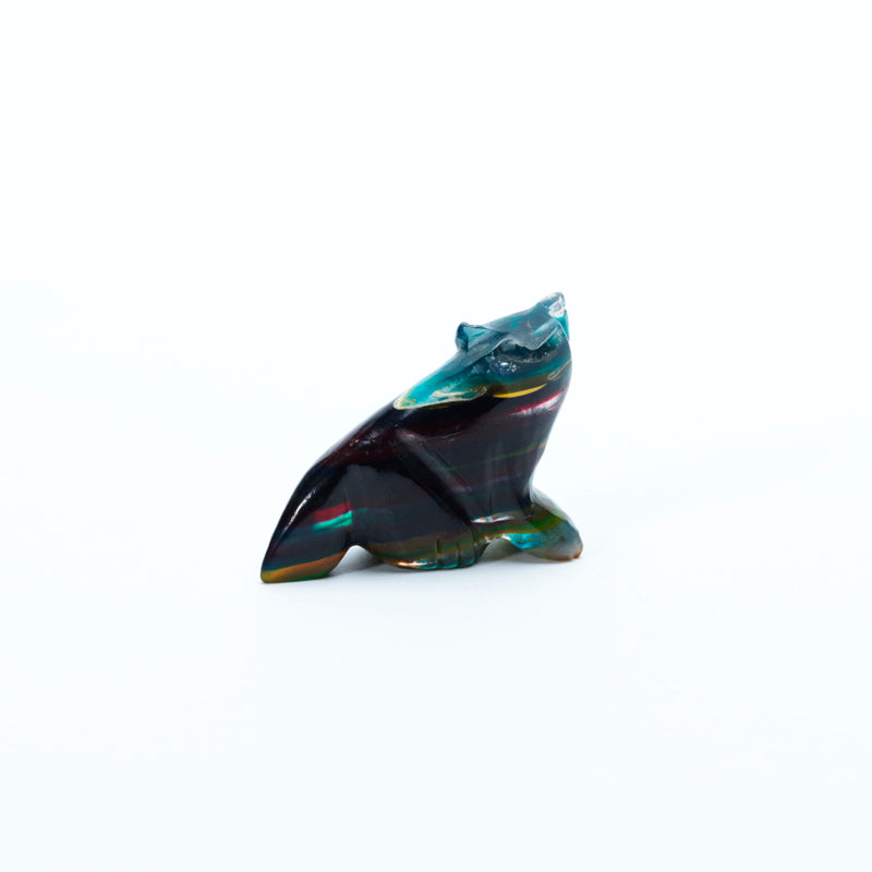 The natural bands and swirls of color give the piece a mystical, almost otherworldly appearance—each shade blending seamlessly into the next, creating a sense of depth and wild energy. The carving captures the wolf’s proud, alert stance with refined precision. Its body is lean and powerful, with defined haunches and a slightly raised head, as if caught mid-howl or watching the horizon. The form conveys strength, intuition, and independence—hallmarks of the wolf spirit. Set into the wolf’s face are two brilliant inlaid turquoise eyes, their vivid glow bringing the carving to life. The eyes offer an intense, soulful gaze—piercing and wise—standing in sharp yet harmonious contrast to the colorful complexity of the sulfite stone. This wolf is more than a work of art; it’s a symbol of loyalty, guardianship, and connection to the wild. With its kaleidoscopic body and luminous turquoise eyes, it feels like a guardian spirit captured in stone—rooted in the earth, yet echoing something far older and deeper.
