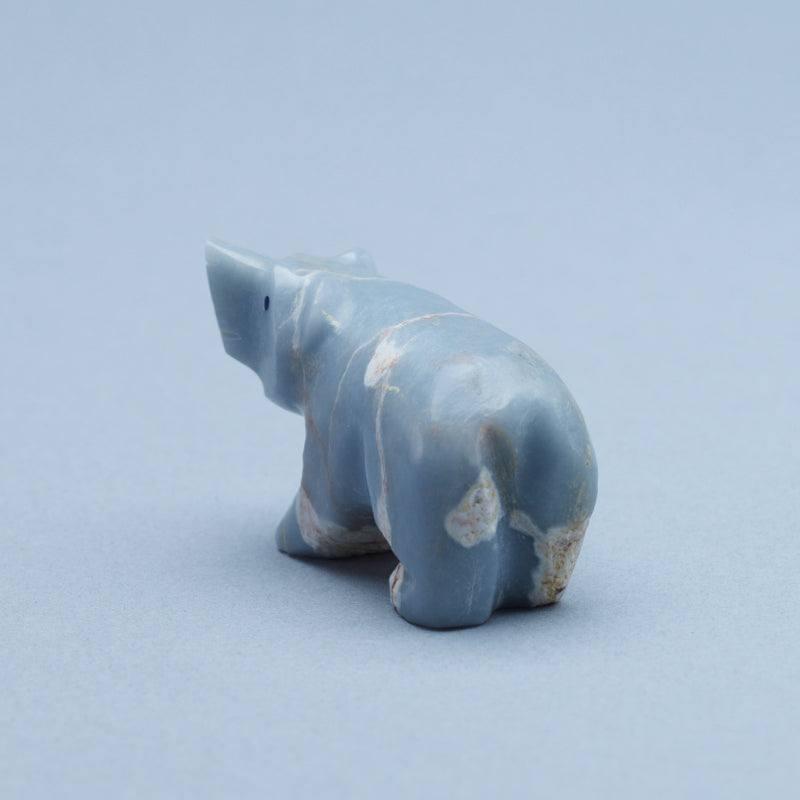 Angelite is a gorgeous blue crystal known for its calming properties, and this handcrafted bear brings those serene qualities to life. The smooth surface of the angelite shimmers in the light, creating an ethereal glow that enhances any space it's placed in. Its gentle expression and sturdy posture evoke feelings of calmness and strength, reminding us to approach life with grace and resilience.