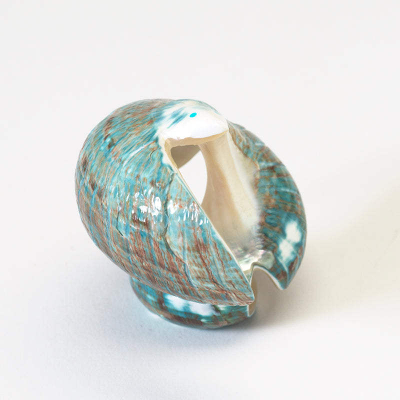 As light hits the shimmering surface of the green snail shell, the eagle appears to come alive, ready to take flight at any moment. The durability and strength of the snail shell representing resilience and longevity, while the striking turquoise eyes evoke a sense of wisdom and clarity.