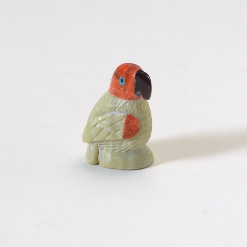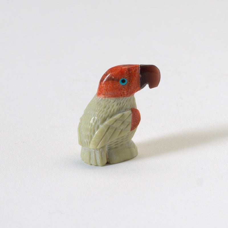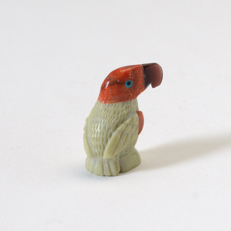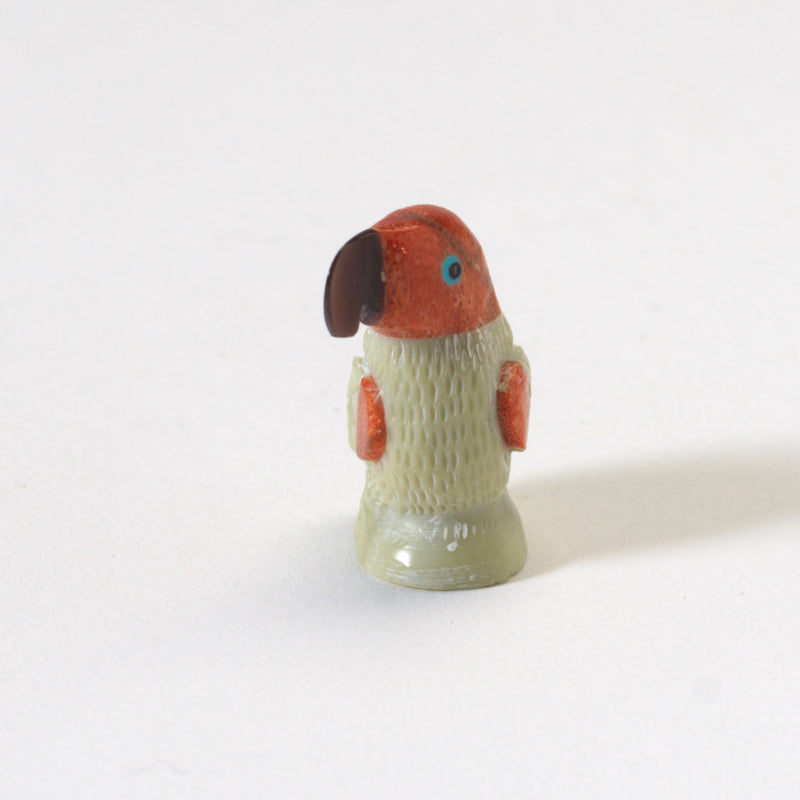 This beautiful serpentine bird with an apple coral head, Penn shell beak, and turquoise eyes is truly a sight to behold. The incorporation of different materials like coral, shell, and turquoise adds depth and vibrancy to the piece, making it stand out . With its unique combination of colors and textures, this serpentine bird embodies creativity and artistry in an enchanting way that is sure to bring joy and beauty wherever it is displayed.