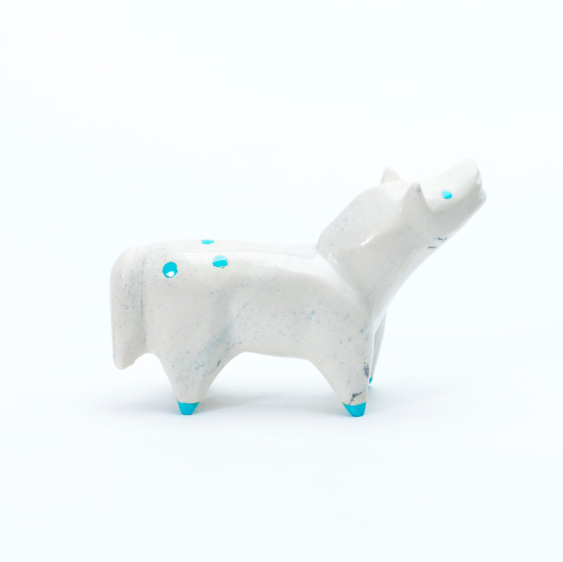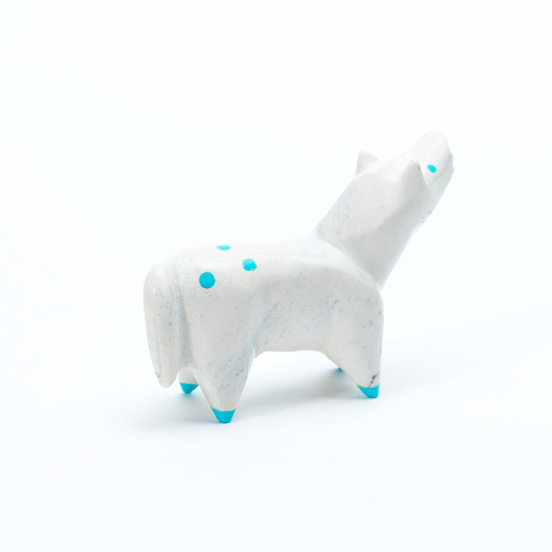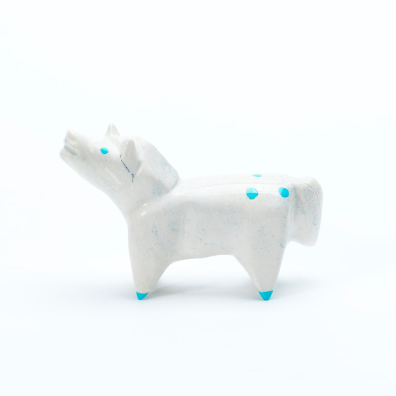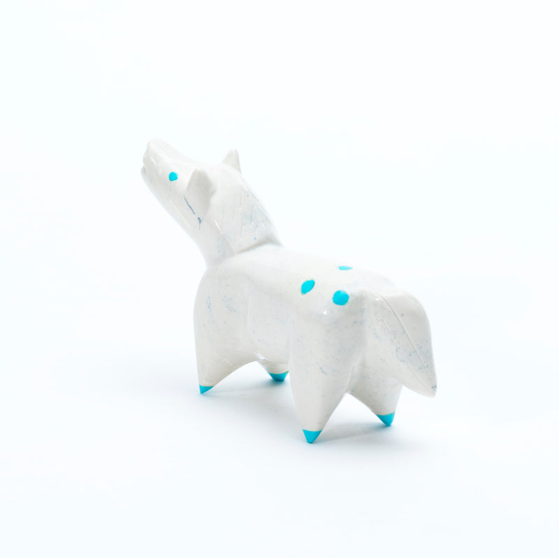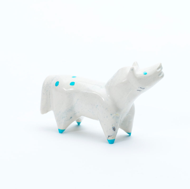 A horse carved from white fish rock stands with a graceful, poised stance, its smooth, polished body showcasing the stone’s soft, creamy tones and subtle natural variations. Bright turquoise eyes lend a lively, alert expression, while matching turquoise hooves provide bold accents that contrast strikingly with the pale white of the fish rock. The combination of the luminous white stone and vivid turquoise details creates a carving that feels elegant, spirited, and full of vitality, highlighting both the beauty of the natural materials and the skillful artistry of the carving.