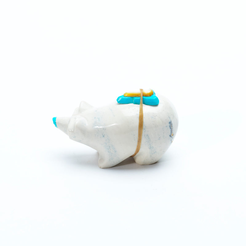 A bear stands in a solid, confident pose, its smooth surface showcasing the stone’s clean, pale tones with subtle natural textures. Bright turquoise eyes and a matching turquoise nose bring a vivid pop of color, adding life and personality to its expression. Resting across the bear’s back is a striking arrowhead crafted from a blend of turquoise and shimmering shell. The contrast between the crisp white stone, vibrant turquoise, and luminous shell creates a visually captivating piece that balances strength, elegance, and spiritual symbolism.