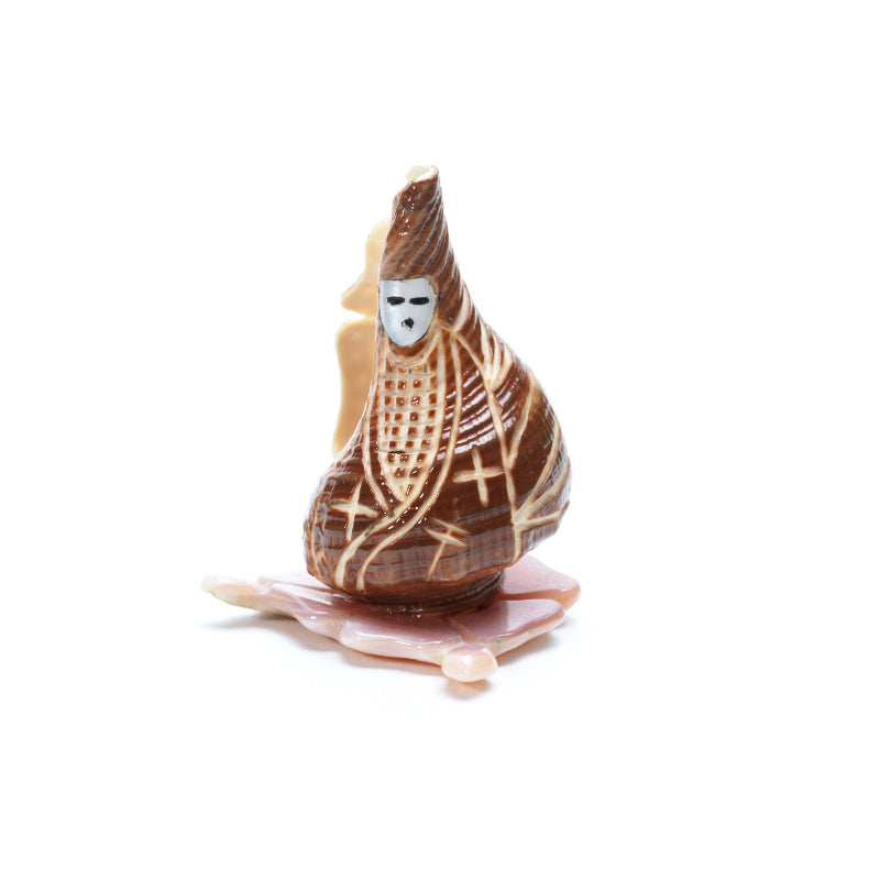 A maiden carved from a smooth cowry shell stands gracefully atop a base shaped like a blooming flower, carved from lustrous pink mussel shell. Her face is delicately inlaid with mother-of-pearl, shimmering with soft iridescent hues of white, cream, and subtle pink, capturing a gentle, serene expression. Small black eyes set into the mother-of-pearl add depth and life, giving the maiden a quietly watchful presence. The pink mussel shell base, intricately carved into petals, provides both stability and a sense of organic beauty, complementing the maiden’s form. The combination of the cowry shell, shimmering mother-of-pearl, and warm pink mussel creates a harmonious, ethereal piece that exudes elegance, delicacy, and the natural beauty of the sea.
