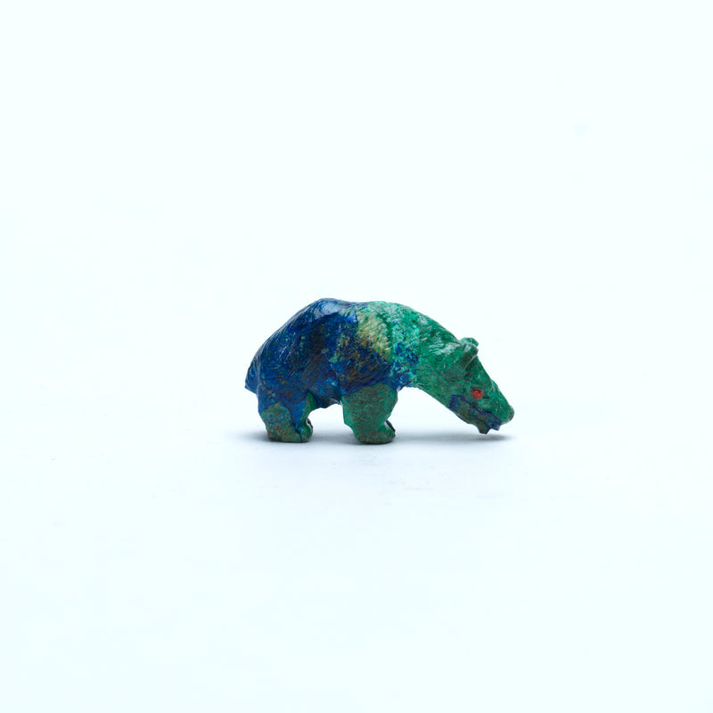 A bear carved of azurite with red eyes is a captivating and powerful piece. The deep midnight blues and rich indigo hues of the azurite create a sense of quiet strength and grounding energy. Subtle veins of lighter blue and touches of green ripple across the surface, giving the carving a natural, almost cosmic depth. The bear’s form is solid and confident, symbolizing protection, healing, and inner power. Its red eyes, add a vivid contrast glowing with intensity and spirit. This piece embodies both strength and serenity, a guardian figure carved from the earth’s vibrant blues and fiery red highlights.