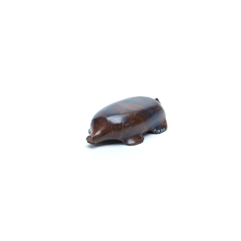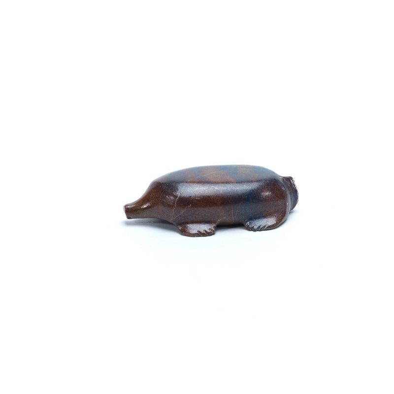 A mole carved from rich argillite, its smooth, dark surface giving the carving a sleek and earthy presence. The natural deep gray to black tones of the argillite highlight the subtle contours of the mole’s rounded body, small limbs, and delicate snout. The carving captures the mole’s characteristic compact form and grounded nature, with polished surfaces enhancing the stone’s natural sheen while retaining an organic, tactile quality. The simplicity of the argillite allows the mole’s shape and posture to take center stage, emphasizing the quiet charm and understated elegance of this underground dweller.