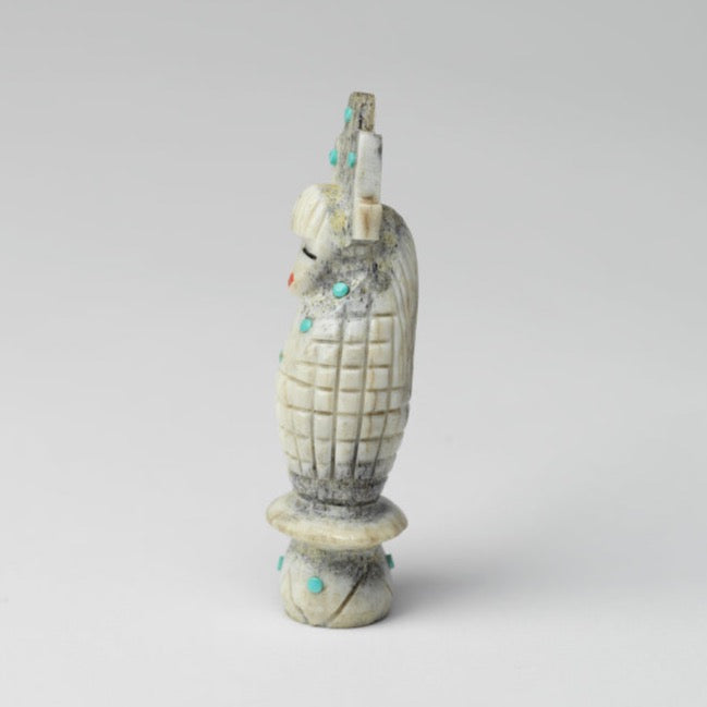 Usually the maiden fetish will be emerging from corn (the corn maiden) or she will have whorls of hair on the side of her head, signifying that she has not had a child. The mother fetish also can be emerging from the corn (the corn mother) and she will have children with her or look pregnant. The grandmother usually has a shawl over her head and no corn represented on her body.