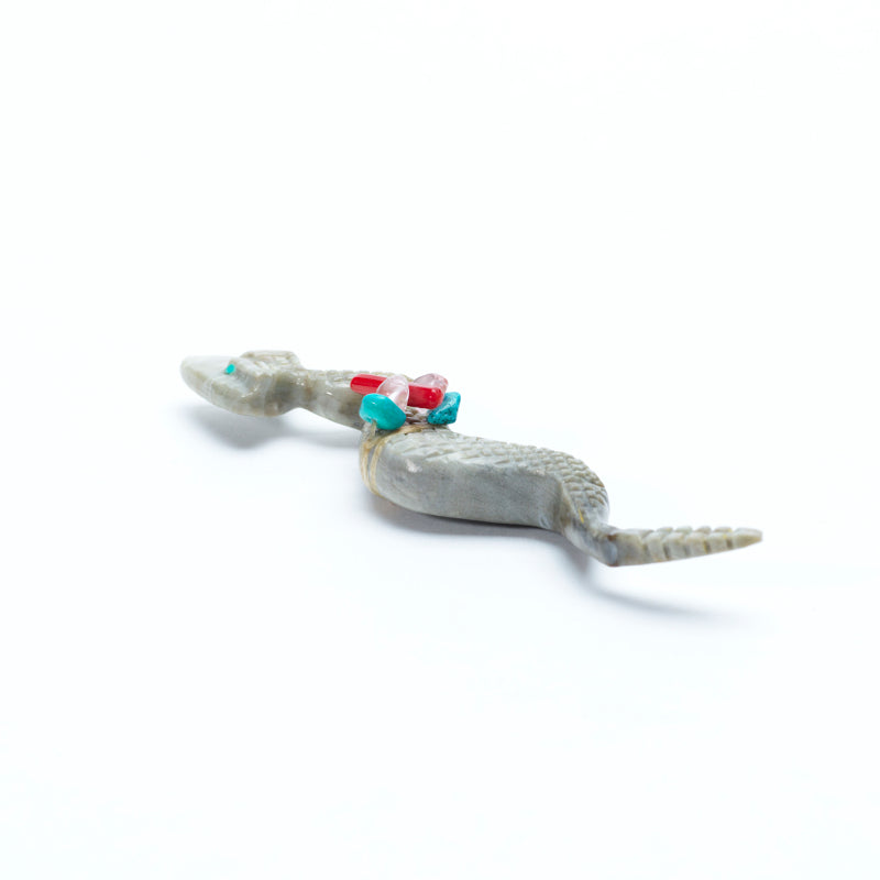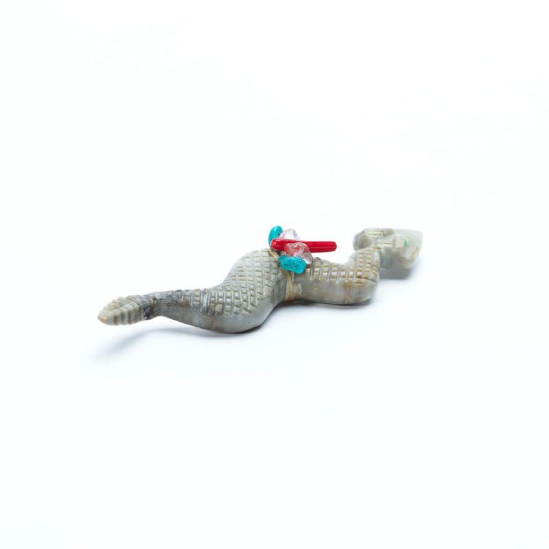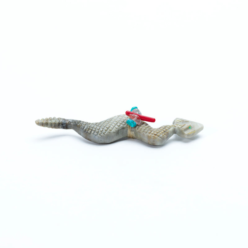 A slithering snake winds gracefully, its sinuous body smoothly polished to highlight the stone’s natural swirls and streaks of soft grey, warm tan, and subtle black. The flowing patterns in the marble add depth and texture, suggesting the sleek scales of the snake and the fluidity of its movement. Set into the head are bright turquoise eyes, their vivid blue hue providing a striking contrast against the earthy tones of the marble and giving the snake a watchful, almost mystical presence.