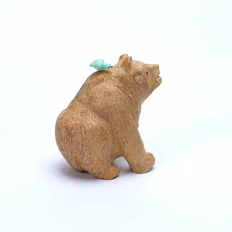 A bear carved from warm tan Zuni stone, its form robust and grounded, exudes a sense of gentle strength. The honey-colored eyes add a soft, expressive warmth, giving the bear a lifelike and contemplative presence. On its paw, it holds a bird delicately carved from turquoise, the vibrant blue stone contrasting beautifully with the earthy tones of the bear, drawing immediate attention. Another turquoise bird rests gracefully on the bear’s back, creating a harmonious composition that evokes a connection between the natural world and its playful, spiritual essence. The overall carving balances solidity and fluidity, with smooth, flowing lines that emphasize the bear’s rounded, powerful form while celebrating the vivid color and energy of the turquoise birds.