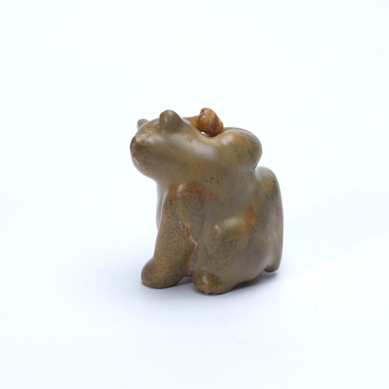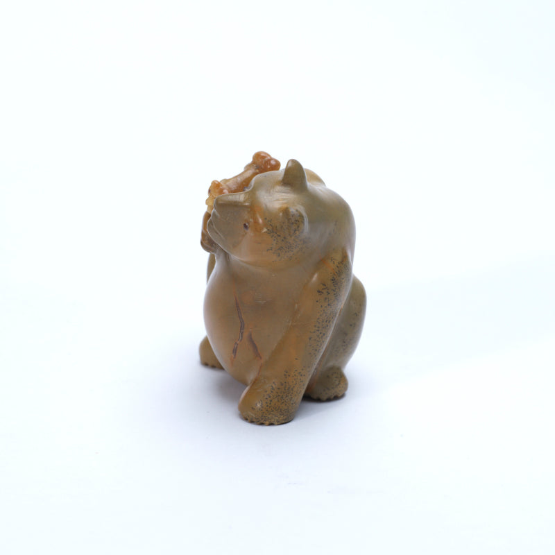 A sitting bear carved from Zuni travertine, its rounded form radiating a calm, grounded presence. The bear’s honey-brown eyes lend warmth and gentle expressiveness, inviting the viewer into its serene gaze. Cradled tenderly on its arm is a squirrel carved from sugar daddy stone, the lighter, creamy tones of the squirrel contrasting subtly yet harmoniously with the warm travertine of the bear. The composition captures a quiet moment of connection between the two creatures, emphasizing both the bear’s protective nature and the playful innocence of the squirrel.