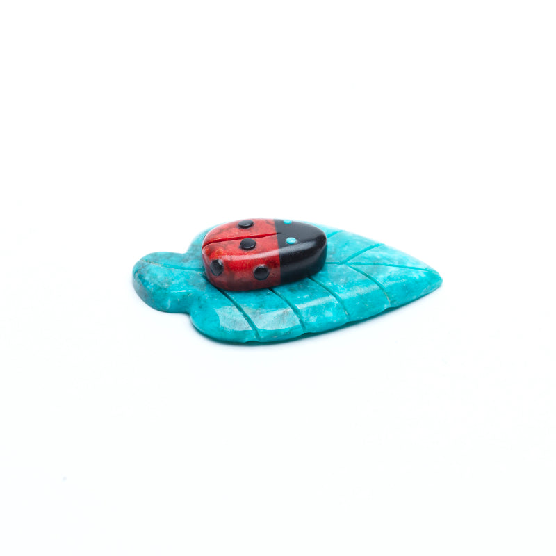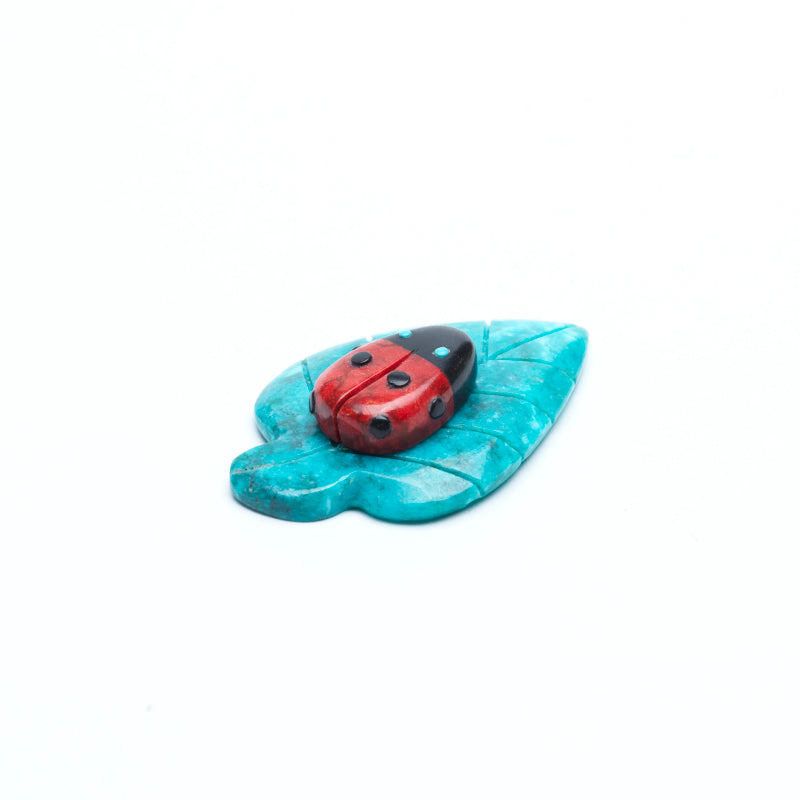 The ladybug’s body is carved from rich red coral, smooth and polished to a soft luster. Its warm, organic hue perfectly captures the bright, unmistakable coloring of a real ladybug, symbolizing good luck, protection, and renewal. Adorning its coral back are inlaid black jet dots, precisely placed and slightly recessed into the surface. These dots are bold and glossy, giving the piece a lifelike charm while enhancing the ladybug’s delicate, jewel-like appearance. Its tiny eyes are inlaid with turquoise, glowing against the red and black with vibrant blue light. Though small, these turquoise eyes bring life and presence to the insect, making it feel watchful and whimsically alert. Beneath the ladybug rests a leaf carved from turquoise, shaped with gentle curves and etched veins to mimic the organic detail of a real leaf. The turquoise in sky blue hue, lending depth and texture to the base. The leaf cradles the ladybug naturally, as if the insect had just landed there, sunning itself in stillness.