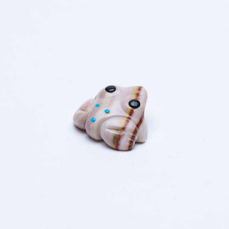 The contrasting black eyes—piercing yet serene—draw you into its enigmatic gaze, inviting contemplation of metamorphosis and renewal. Adorning its back are vibrant turquoise inlaid dots, each seemingly alive with energy, echoing the tranquil blues of rippling waters. This exquisite piece is not merely a carving; it is a vessel of stories waiting to be told—a testament to transformation and resilience amid adversity. In its silent repose lies power and purpose, transcending mere aesthetic allure to capture the heartbeat of life itself in a dance between stone and soul.