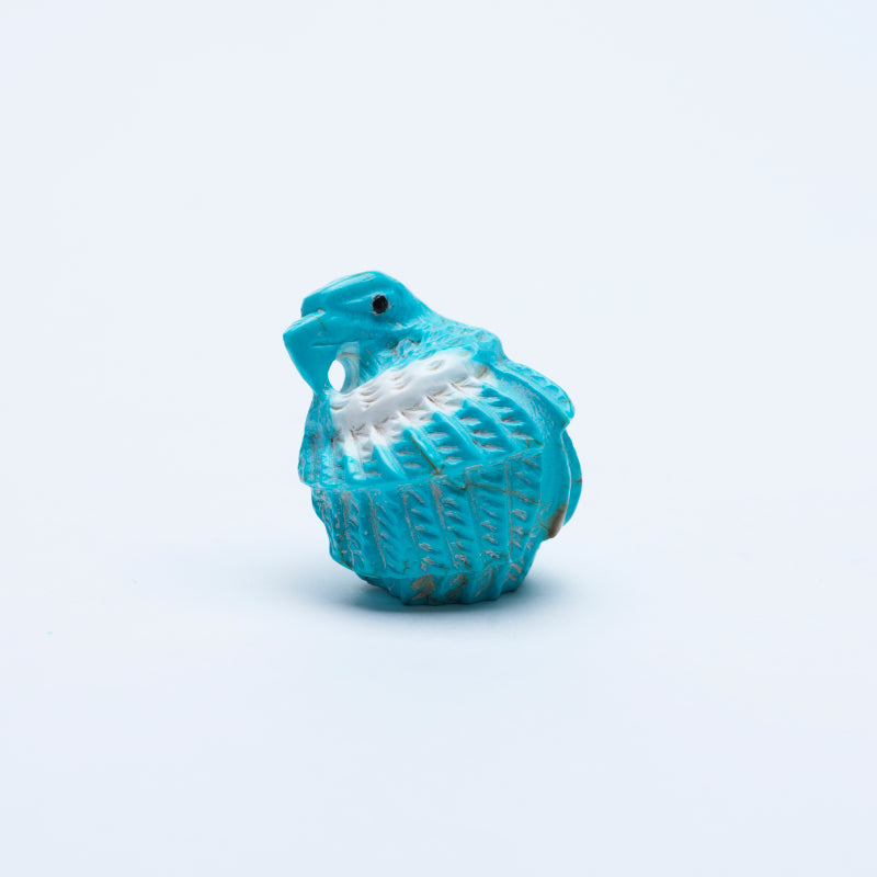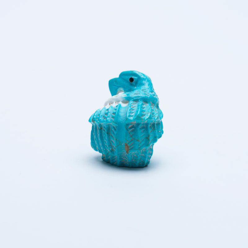 The vivid blue hue of the turquoise symbolizes protection and strength, while the striking black eyes add an element of intensity and focus. The choice to depict the eagle in the act of grasping onto a turtle is both intriguing and enigmatic - perhaps suggesting a struggle between two opposing forces or an eternal battle between predator and prey. The intricate details carved into the turquoise only enhance the dramatic nature of this piece, drawing in viewers with its complexity and symbolism. This carving serves as a reminder of the beauty and fierceness of nature, capturing a moment frozen in time that sparks curiosity and contemplation.