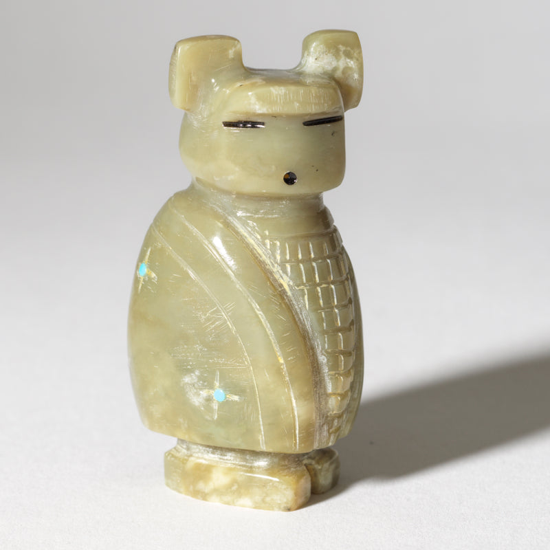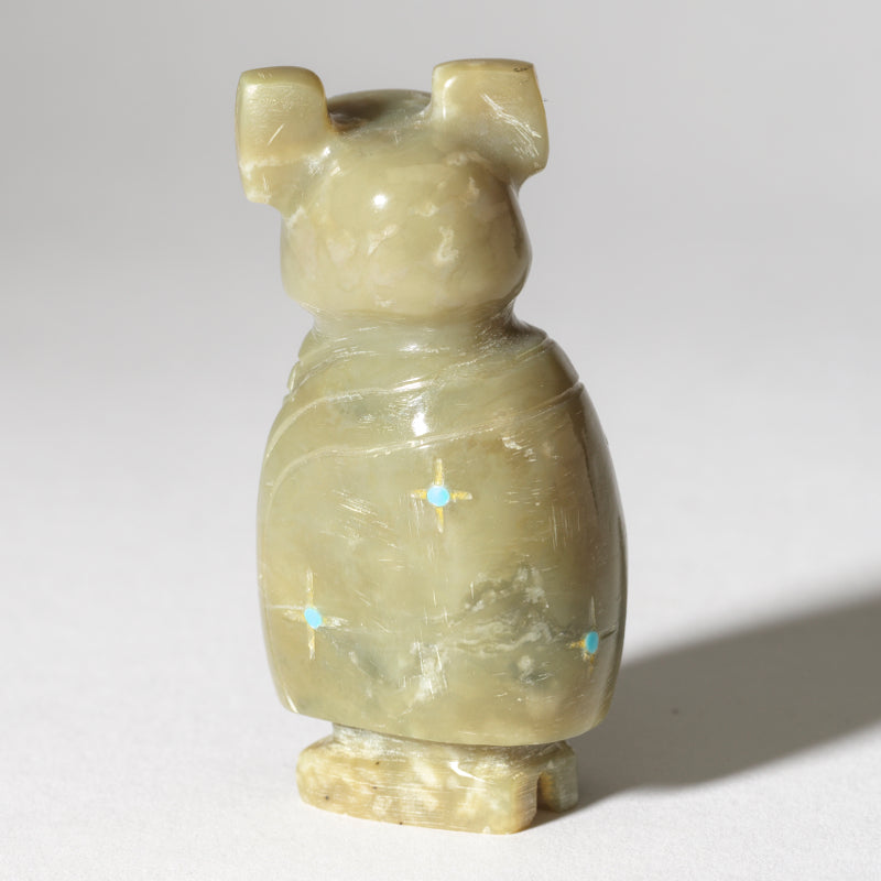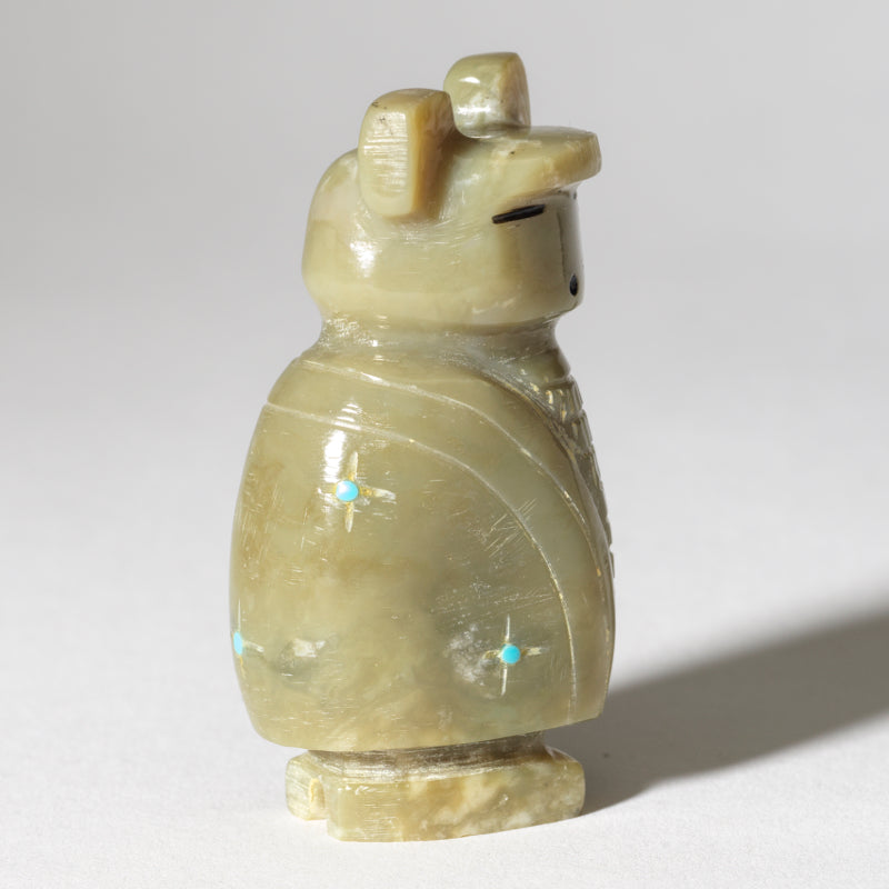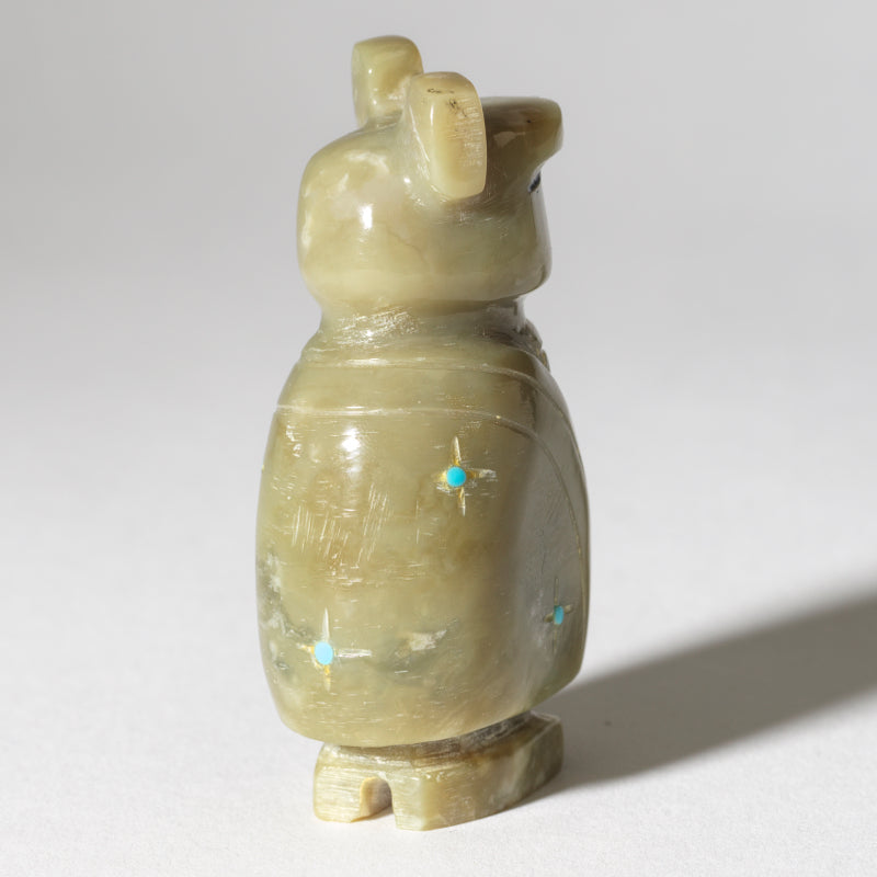 The rich emerald hue of the serpentine stone highlights the delicate features of the maiden, bringing her to life with a sense of ethereal beauty. The intricate turquoise inlay adds a pop of color and texture, enhancing the overall aesthetic appeal of this stunning piece.
