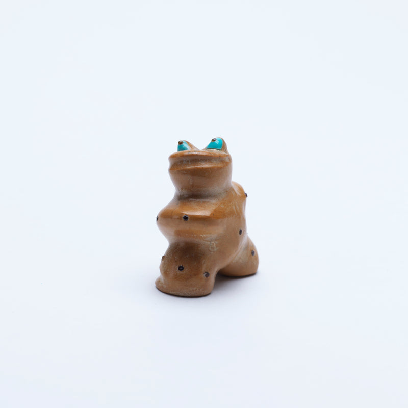 The precision of the black inlay dots emphasizes the frog's natural markings, while the shimmering turquoise eyes seem to sparkle with an otherworldly energy. This carving captures not only the physical essence of a frog, but also its spiritual significance in Zuni culture, symbolizing transformation and renewal. Displayed prominently, this piece is sure to draw admirers into its captivating world where beauty meets symbolism in perfect harmony.