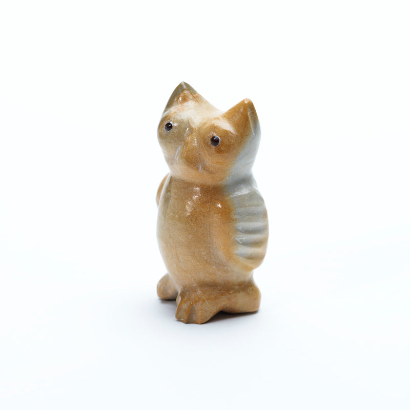 The stone’s natural cream, beige, and soft brown veining gives the owl an earthy, textured appearance, as if it emerged from the desert cliffs themselves. Deep, rich garnet eyes are set into its face, gleaming like polished jewels and conveying sharp intelligence and a watchful spirit. The combination of the warm travertine and the fiery garnet eyes creates a striking contrast, giving the carving both a grounded, natural presence and an air of mystical insight.