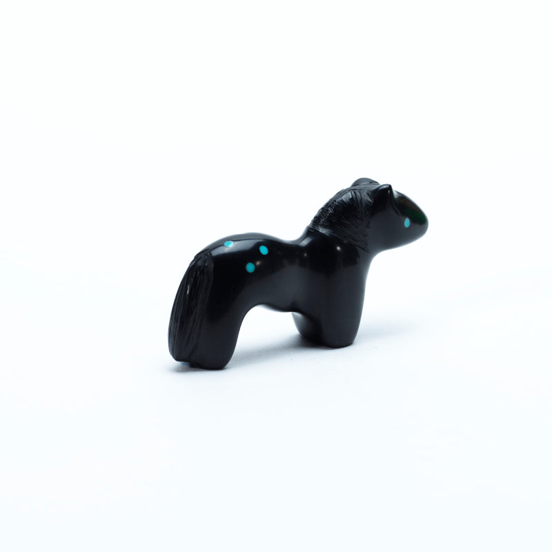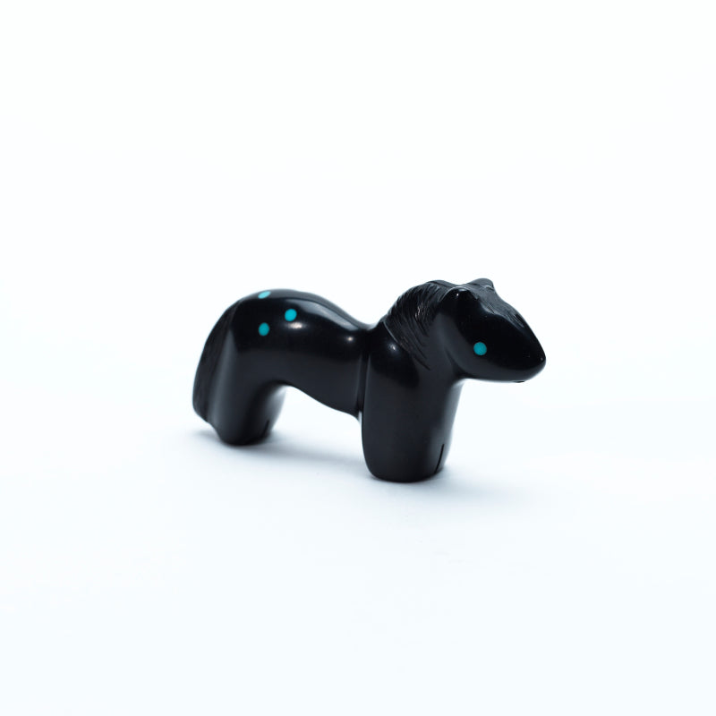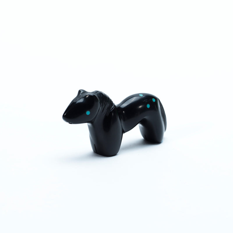 A horse carved from deep black jet stands sleek and elegant, its polished surface reflecting light like liquid shadow. The smooth curves of its neck and powerful legs give a sense of motion even in stillness. Bright turquoise eyes gleam vividly against the dark stone, adding a spark of life and spirit. On its hindquarters, six small turquoise inlaid dots form a deliberate pattern, their blue color glowing like stars against a night sky. The contrast between the jet’s velvety darkness and the turquoise’s vibrant hues creates a striking balance, giving the piece a sense of mystery, vitality, and quiet strength.
