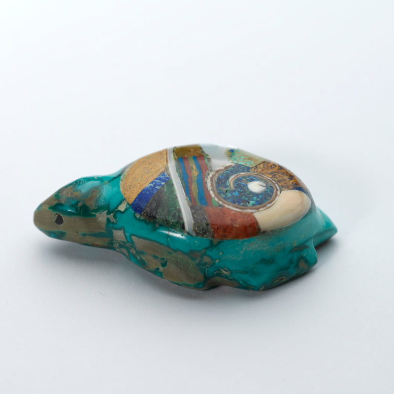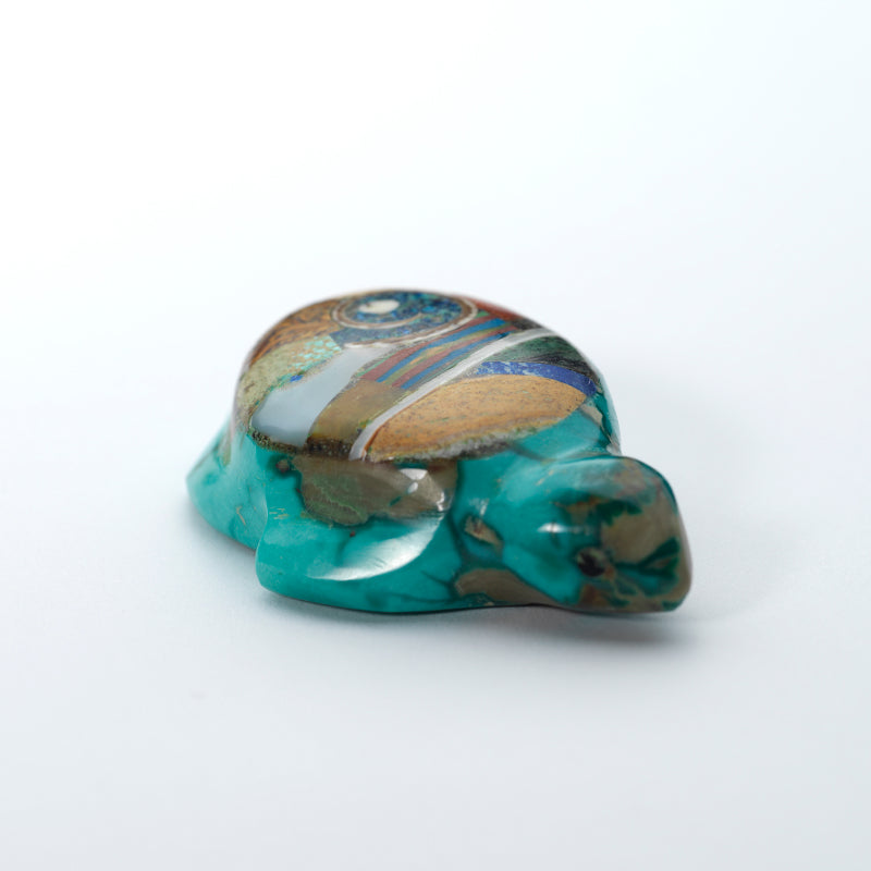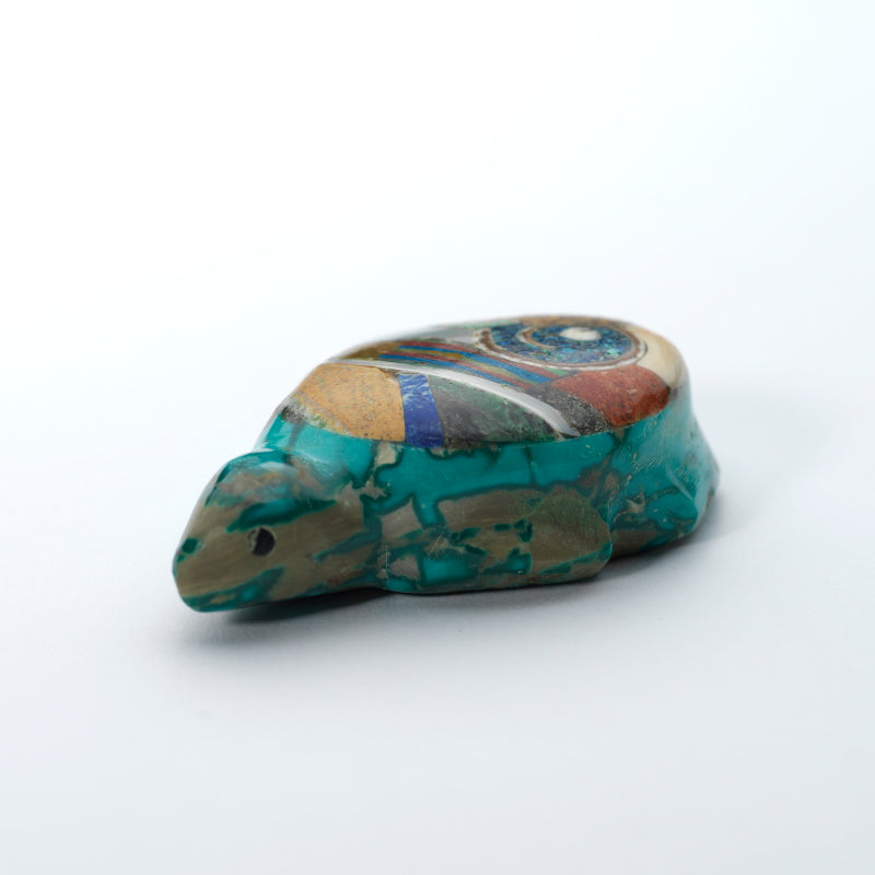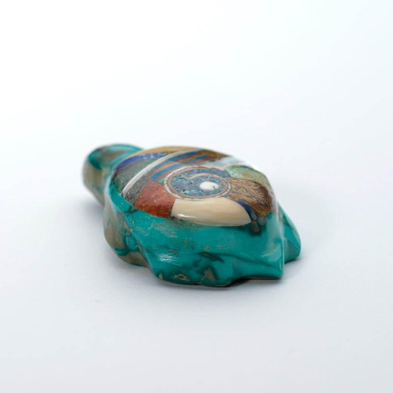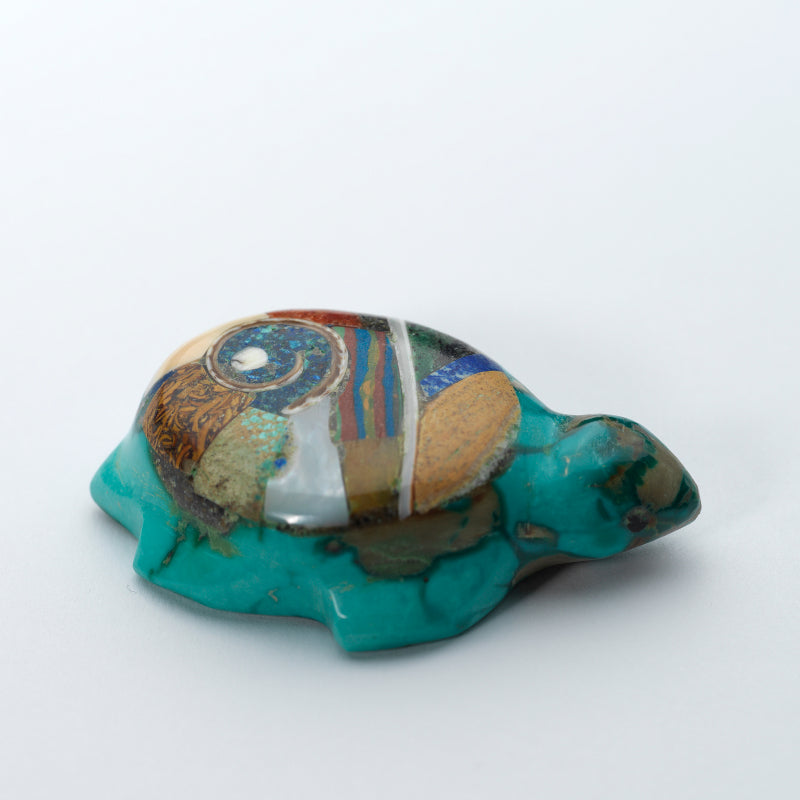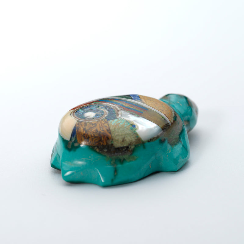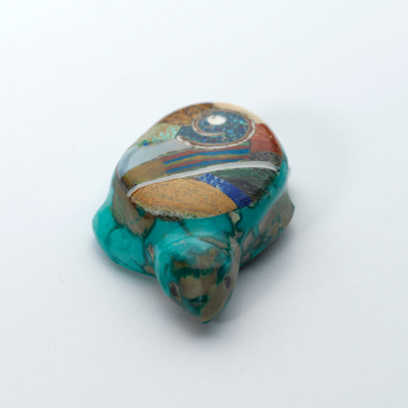 The detail is mind-blowing, with each tiny piece of the mosaic expertly crafted and fitted together like a puzzle. The vibrant hues of blue and green from the turquoise give the turtle a whimsical touch, making it stand out among other carvings. It's definitely something that would catch anyone's eye!