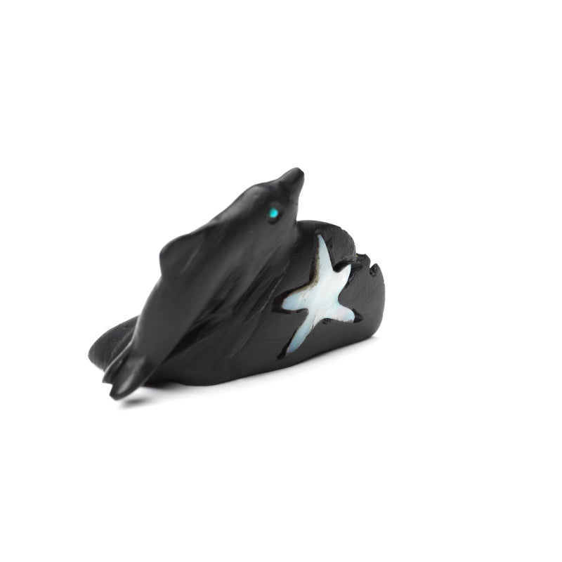 It features a dolphin and a turtle, both finely carved out of black jet, which gives them an elegant, smooth appearance. The attention to detail is striking; you can see each curve and crevice that makes up their bodies. Moreover, nestled between these two creatures is an inlaid starfish made of shell. The combination of the dark jet against the iridescent shell creates a captivating contrast that draws your attention instantly. It's as if these animals exist in harmony with the sea, perfectly captured within this sculpture.