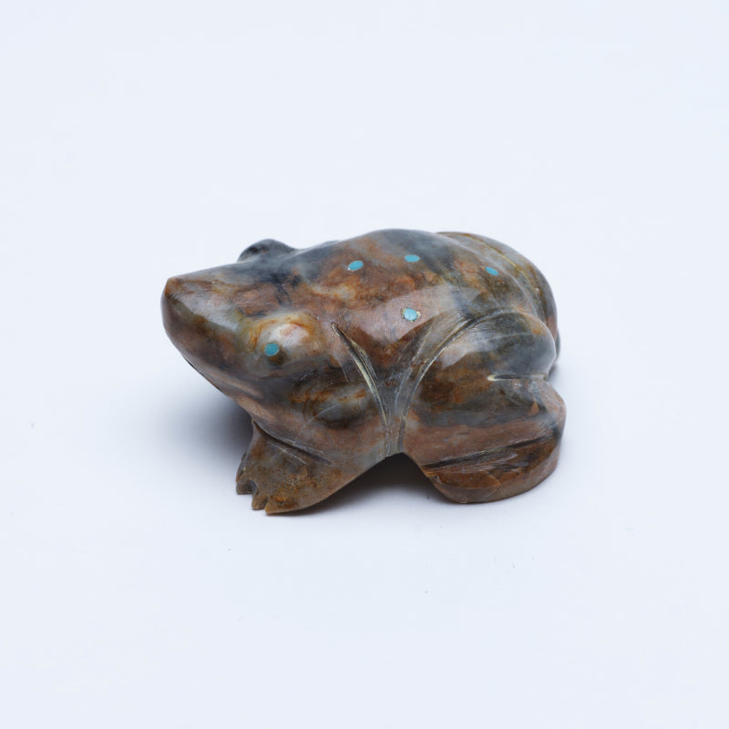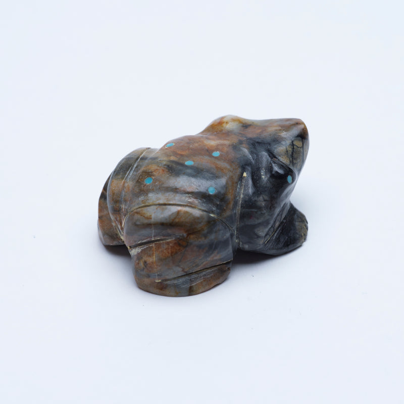The intricate patterns in the marble bring a sense of depth and texture to the carving, making it a truly captivating work of art. The piercing turquoise eyes add a touch of mystique and intrigue to the frog's expression, drawing viewers into its gaze. Its presence is enchanting, evoking emotions ranging from awe to wonderment as one contemplates the skillful artistry behind its creation.