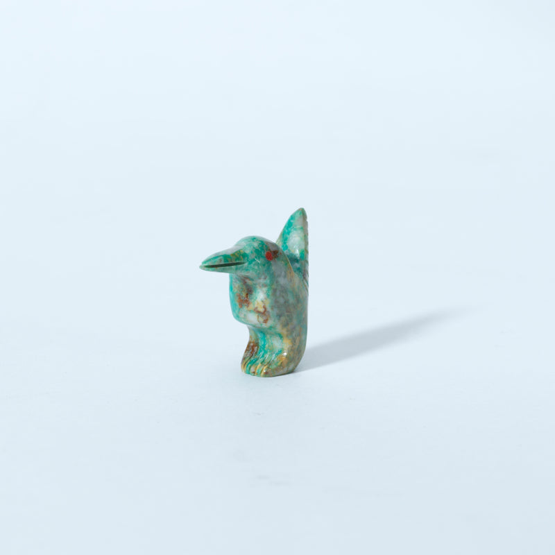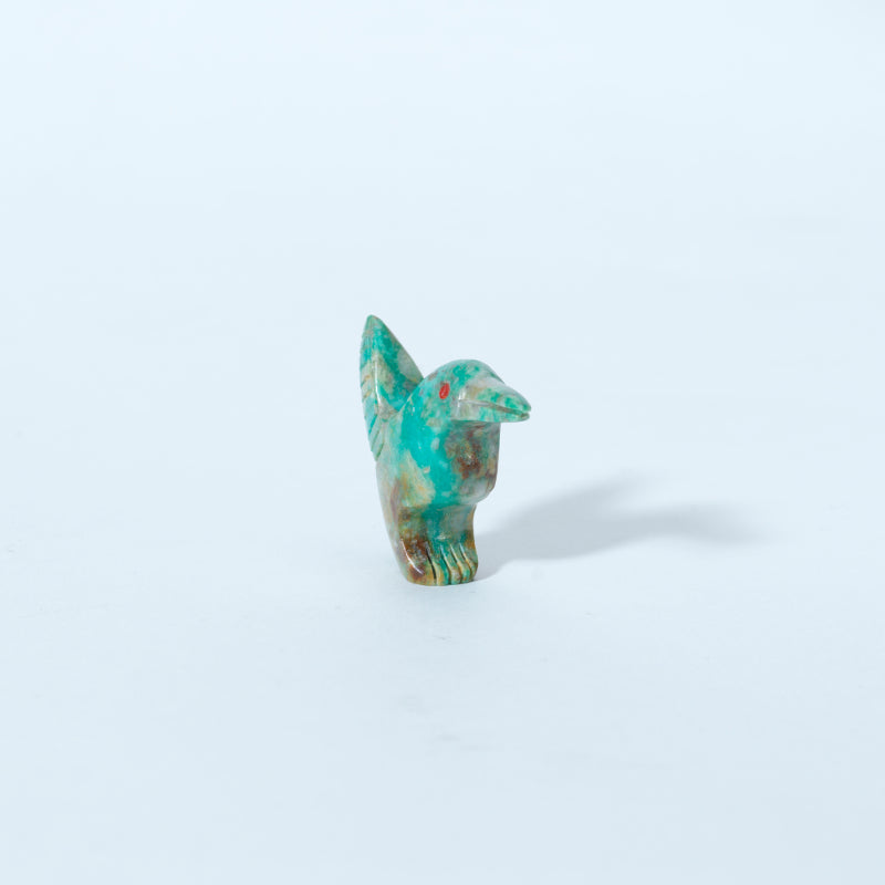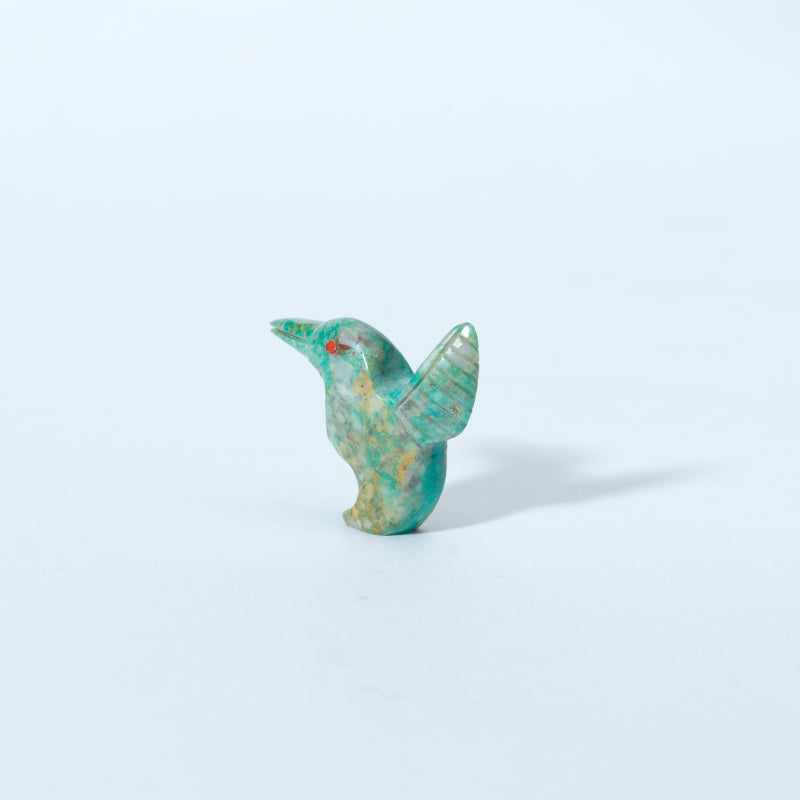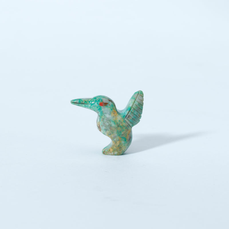 A hummingbird carved from vibrant turquoise captures the delicate grace and energy of the tiny bird. The polished surface highlights the stone’s natural green hues, giving the carving a luminous, lively quality. Its red eyes stand out boldly against the turquoise, adding a vivid focal point that brings the bird to life. Sleek, elegant, and full of motion, this turquoise hummingbird embodies both the beauty of nature and the skill of Kenric.