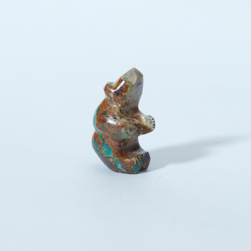 A sitting bear displays a rich, earthy blend of colors, with the natural veining of the stone adding depth and texture to its rounded, polished form. The bear’s posture is calm and grounded, capturing a sense of quiet strength and presence. Its blue turquoise eyes shine brightly, providing a vivid contrast to the warmer tones of its body and giving the bear a lively, alert expression. Balanced, striking, and full of character, this turquoise bear combines natural beauty with craftsmanship.