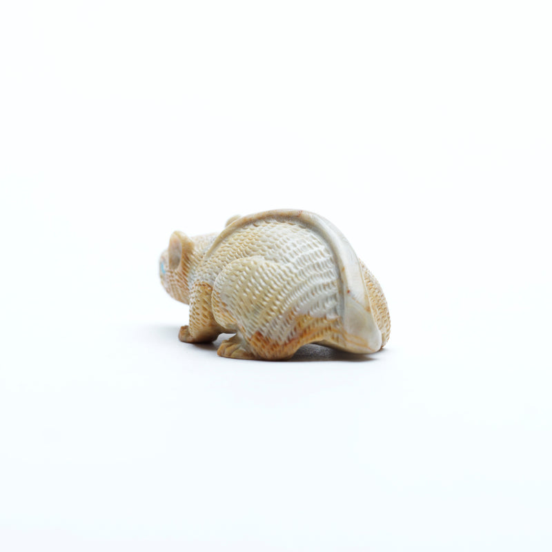 These natural lines in the stone mimic the soft fur and agile body of a real mouse, giving the carving a lifelike sense of movement and texture despite its polished smoothness. Its body is sleek and rounded, with gently arched haunches, a pointed snout, and finely shaped ears tucked attentively forward. The tail curls and rests on top of its back, subtly integrated into the flow of the stone’s natural grain. What brings the carving to life are its turquoise eyes—two tiny, vivid dots of blue that stand out brightly against the earth-toned marble. These eyes shimmer with intelligence and curiosity, suggesting a creature that is alert, cautious, and quietly aware of its surroundings.
