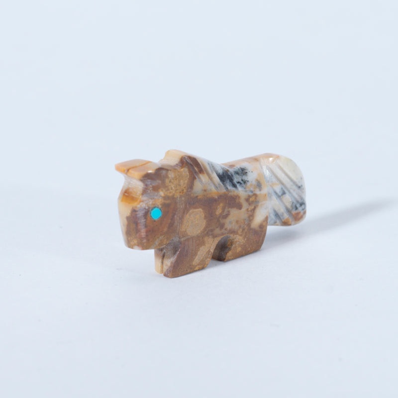This elegant horse carving is crafted from creamy dolomite, its soft beige and light brown tones accented by subtle natural veining that adds depth and character to the piece. Its bright turquoise eyes provide a vivid contrast against the warm dolomite, bringing life, alertness, and spirit to the carving. The turquoise adds a symbolic touch of protection and vitality, enhancing the piece’s presence. Representing strength, freedom, and endurance, the horse embodies both power and grace. This dolomite carving is a harmonious combination of natural beauty, refined craftsmanship, and cultural symbolism, making it a timeless and captivating work of art.