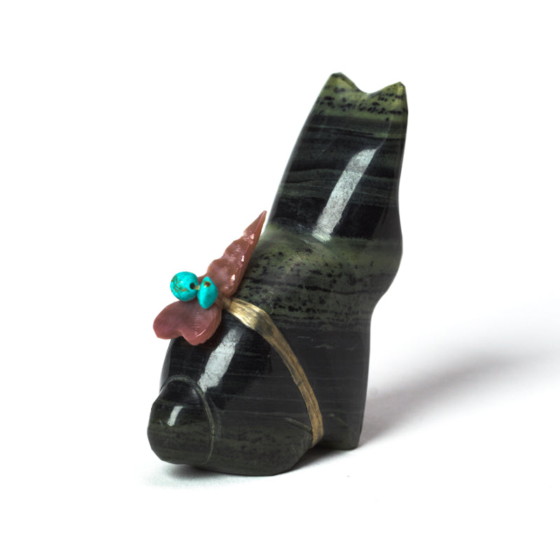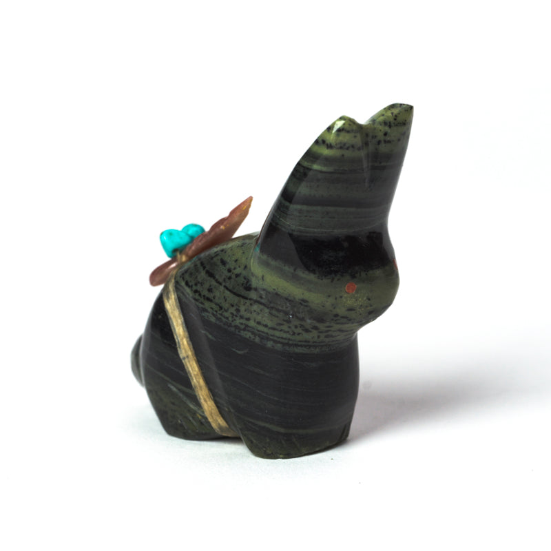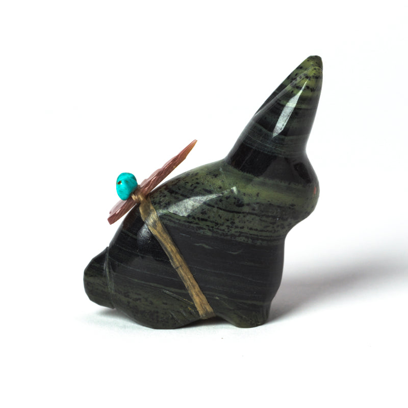 Ricolite, also known as verd antique marble, is a rare and stunning stone found primarily in New Mexico. The unique mix of swirling greens and browns gives each piece a captivating and one-of-a-kind appearance. With its intricate details and smooth finish, this rabbit carved of ricolite is sure to bring joy and fascination to anyone lucky enough to admire it.