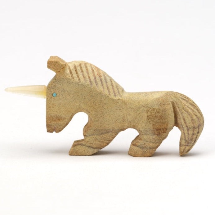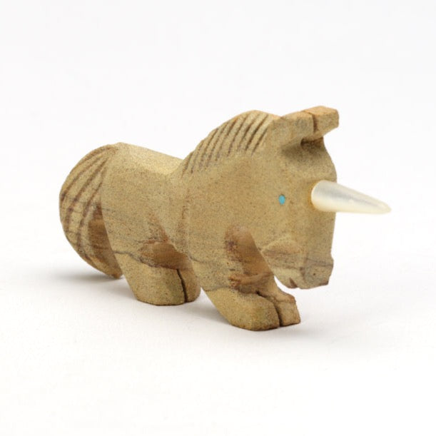 It's like something out of a dream! The sandy texture gives it a rustic charm, while the shimmering mother of pearl horn adds an elegant touch. And those turquoise eyes? They're mesmerizing, sparkling with an otherworldly beauty. This piece is truly a work of art that captures the magical essence of unicorns.