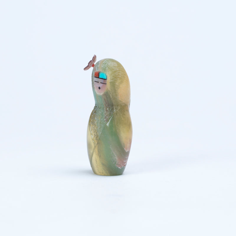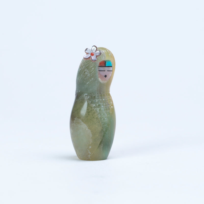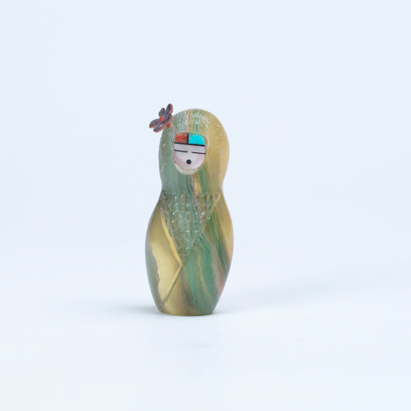 The little flower on Megans maiden is so nicely carved with such small intricate detail it sets a different approach making this sun face corn maiden one of a kind. Aside the detail in the flower the maiden itself is carved to perfection and the surface looks stunning with the turquoise, coral and black jet inlay.