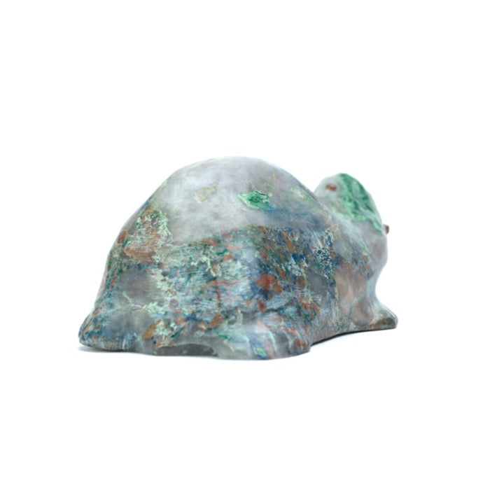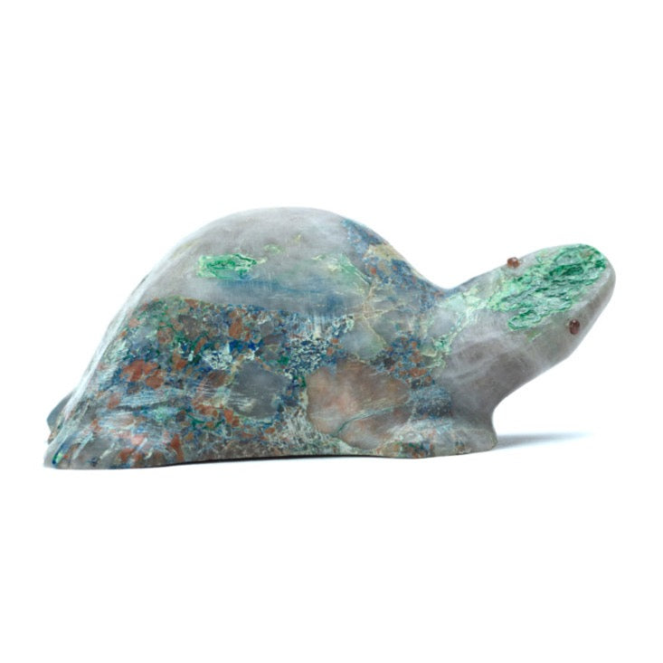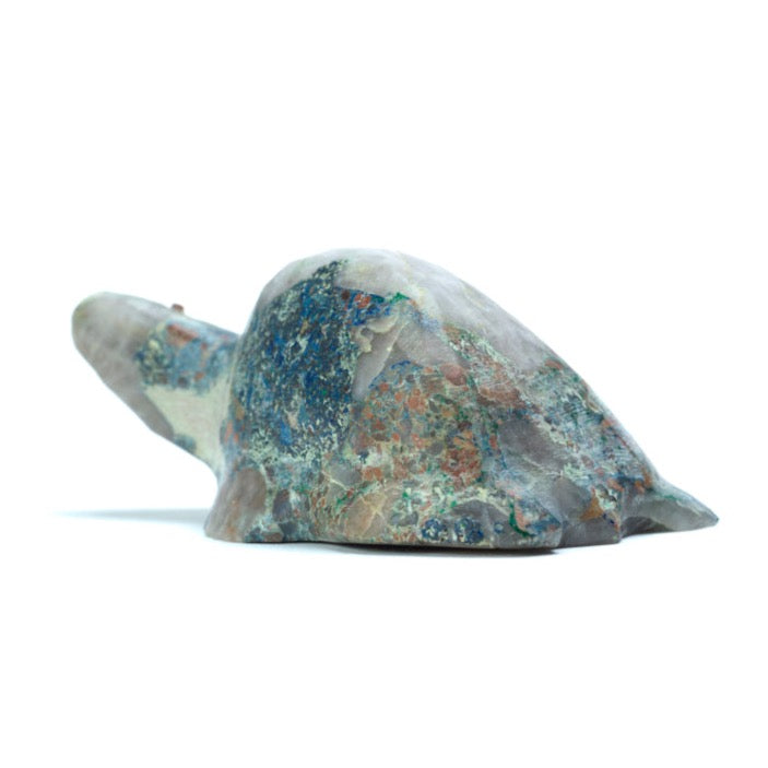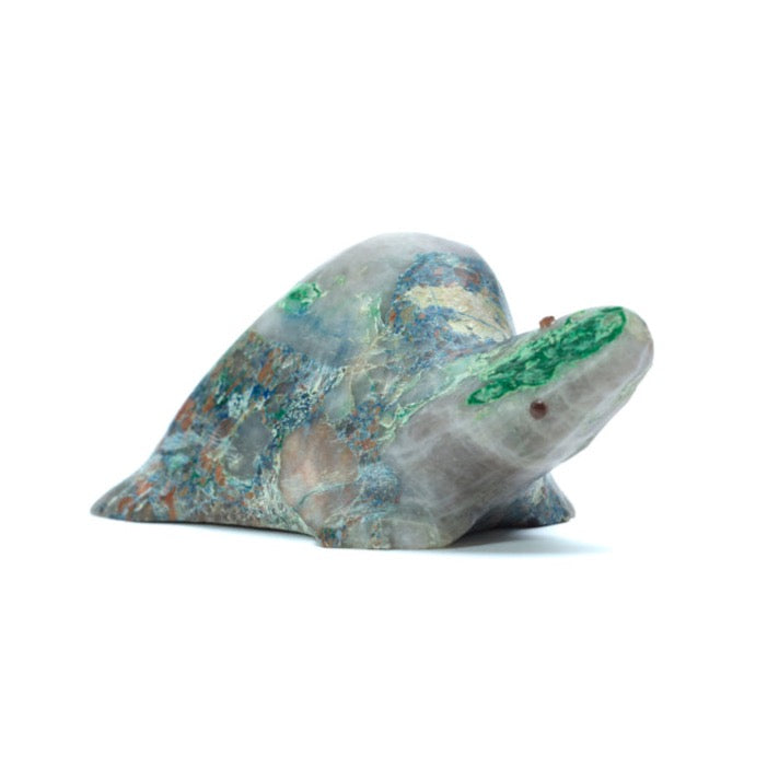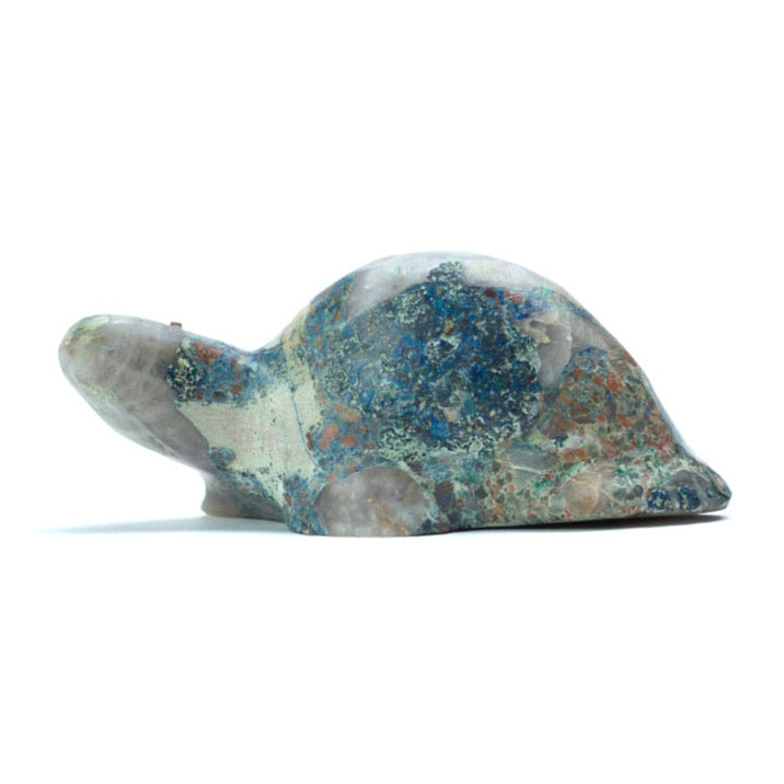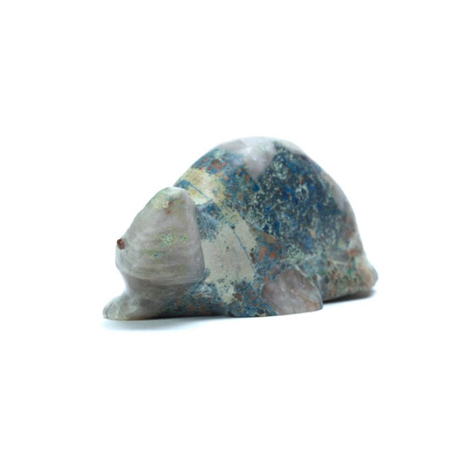 The combination of the Zuni stone, known for its healing properties, and the Azurite, believed to enhance intuition and communication, makes this turtle not only a stunning work of art but also a powerful spiritual ally. As I hold it in my hands, I can feel the energy emanating from it, filling me with a sense of grounding and insight. This unique blend of stones creates a harmonious balance that brings both beauty and meaning to this exquisite carving.